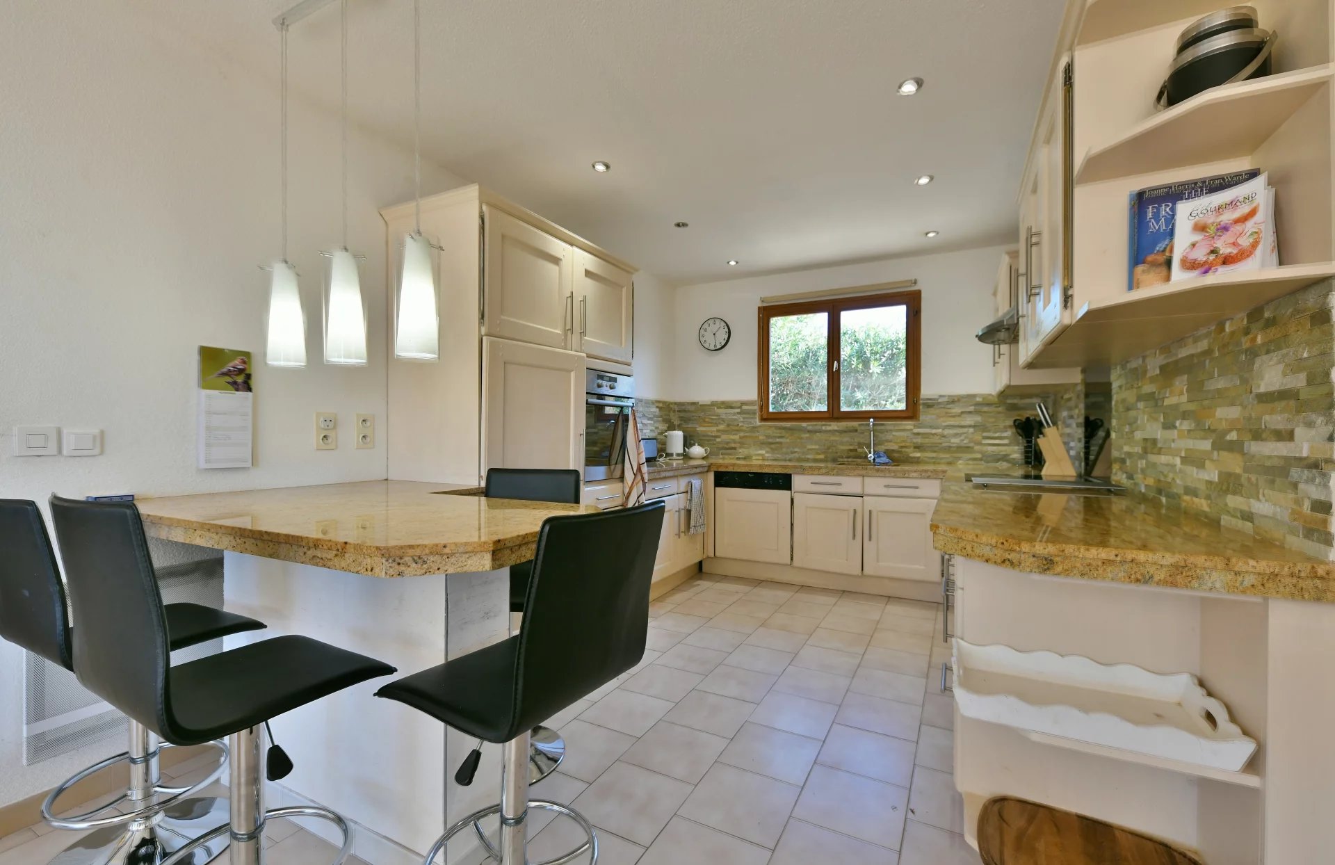En entrant par une vaste terrasse d’environ 30m², vous découvrirez un espace de vie lumineux avec cuisine ouverte, entièrement équipée.