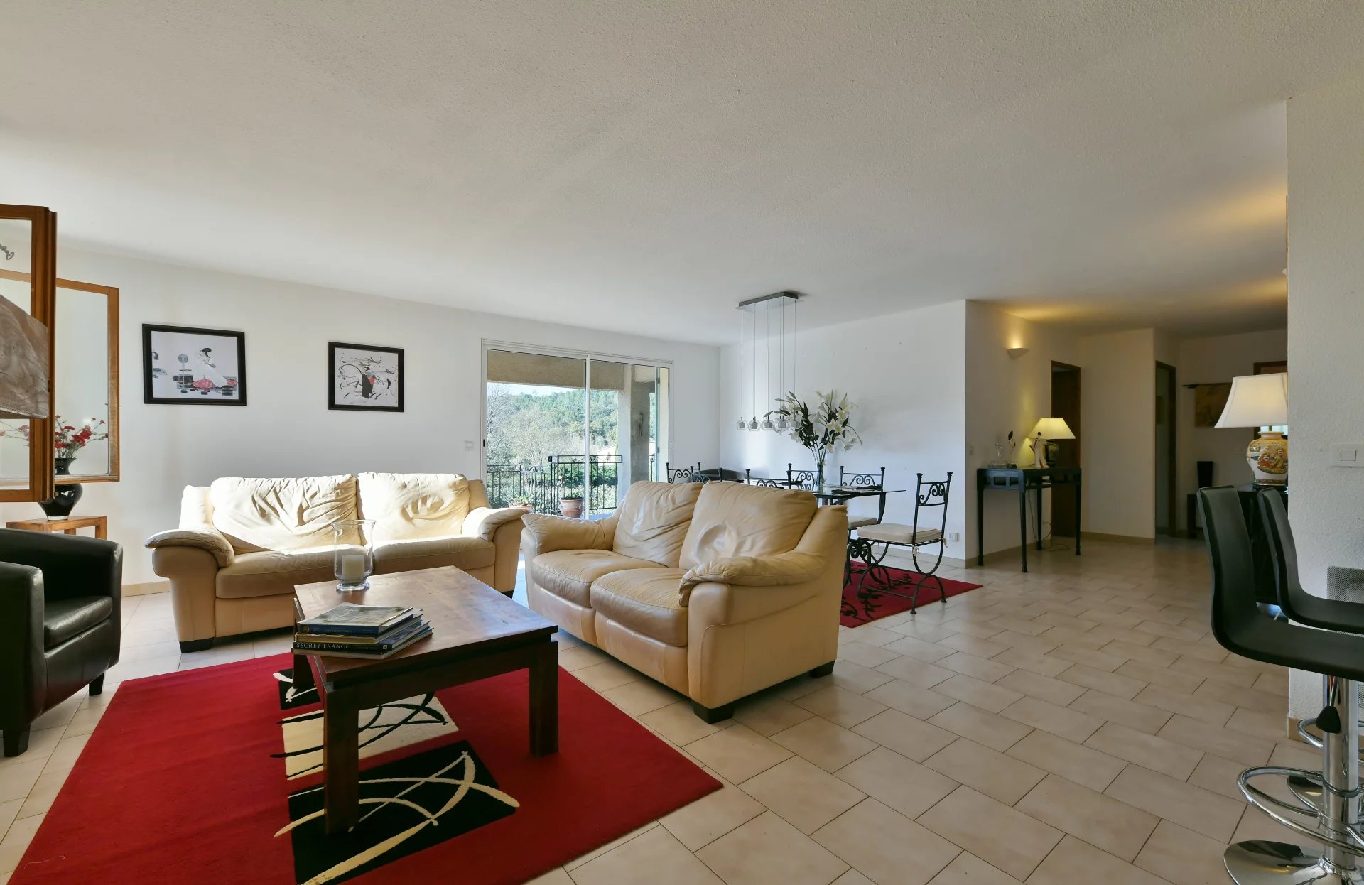 En entrant par une vaste terrasse d’environ 30m², vous découvrirez un espace de vie lumineux avec cuisine ouverte, entièrement équipée.