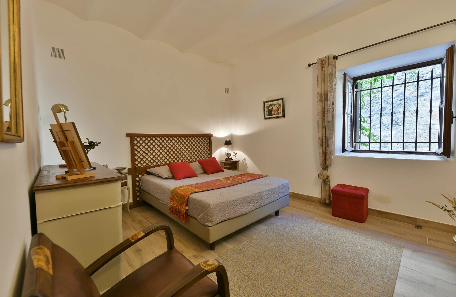 Au rez-de-chaussée, un premier ensemble de réception voûtée, un salon avec cheminée ainsi qu’un espace nuit avec une chambre confortable et une salle de douche. De l’autre côté de l’imposante façade en pierre une cour intime.