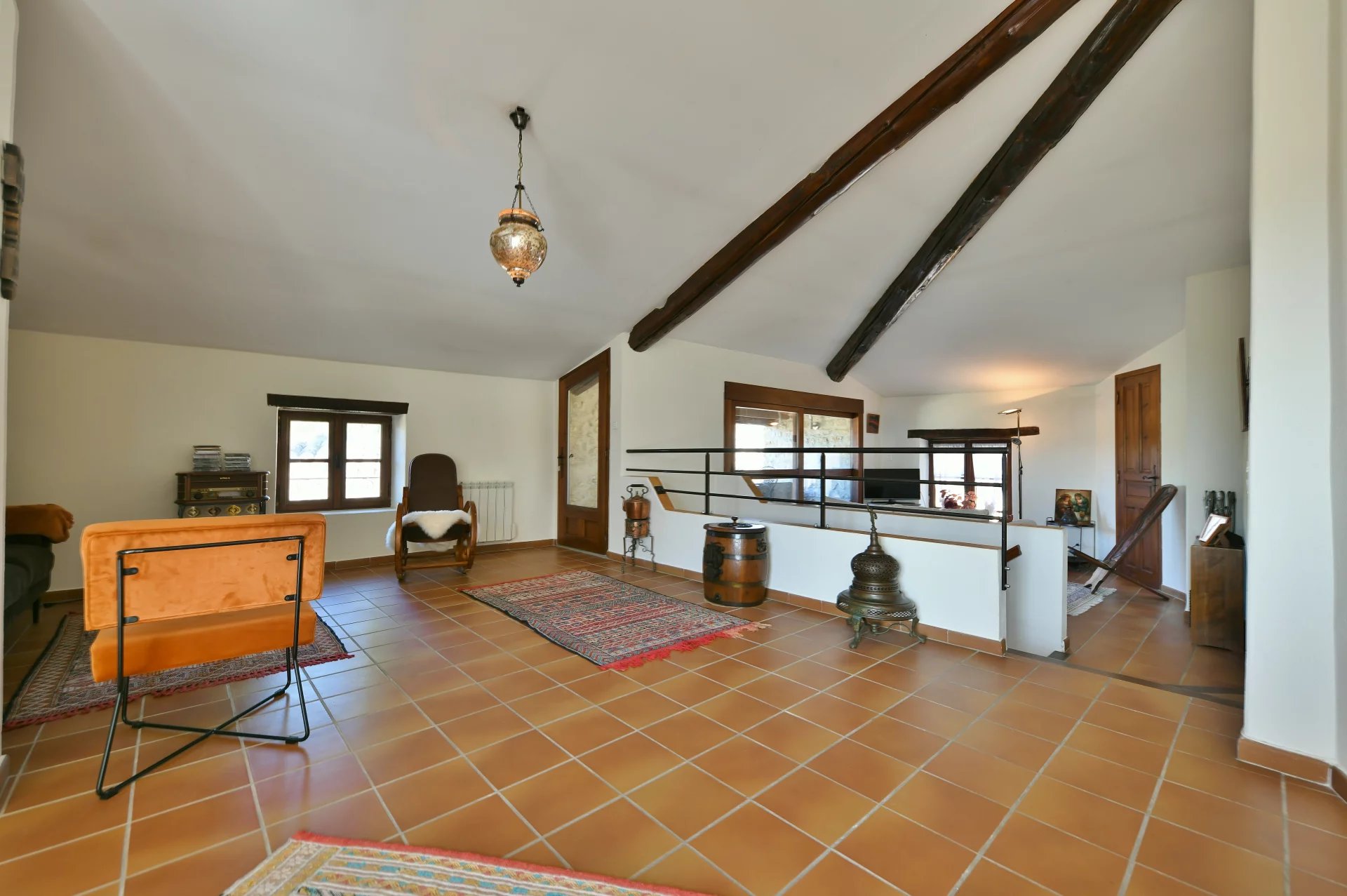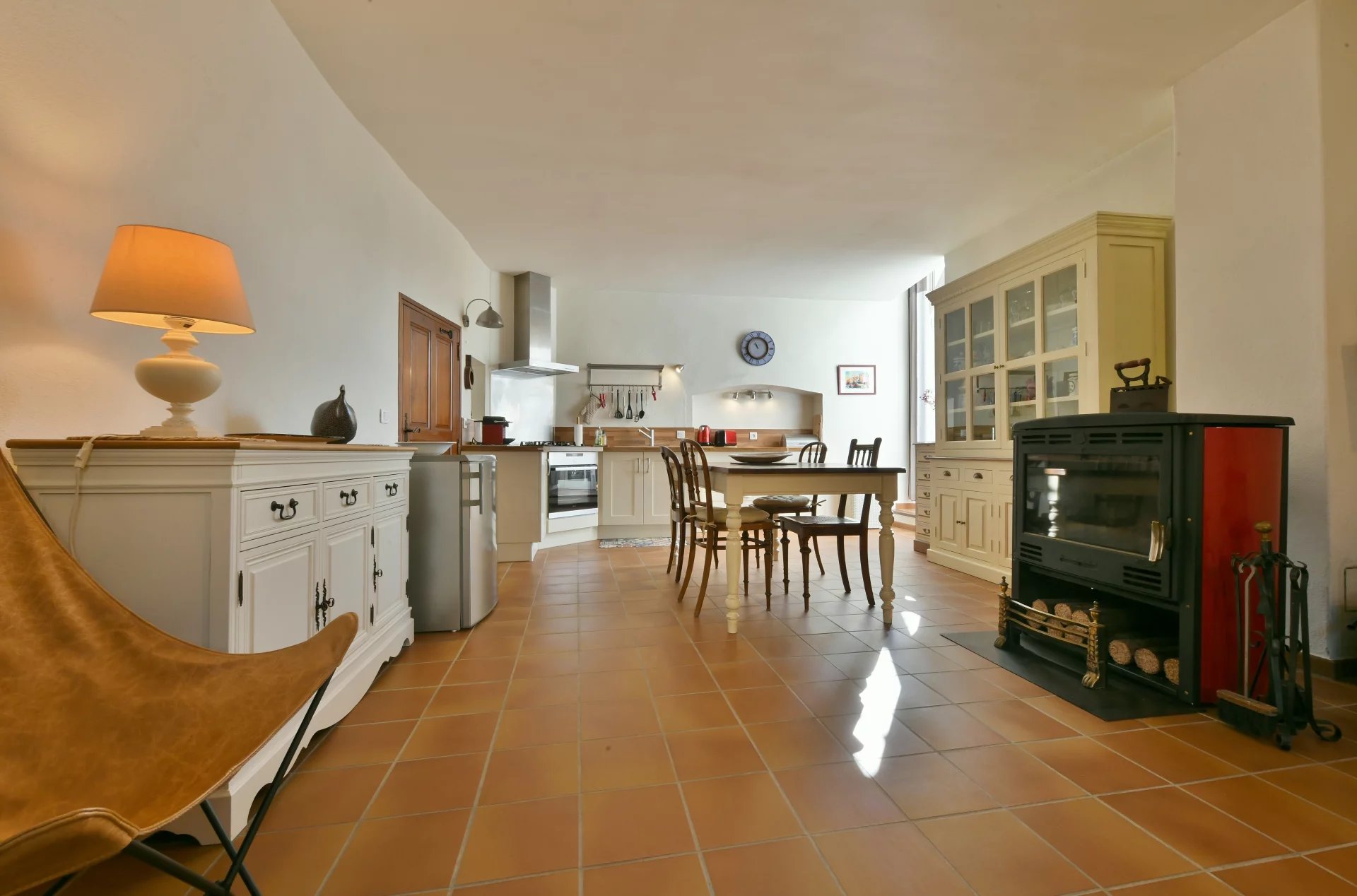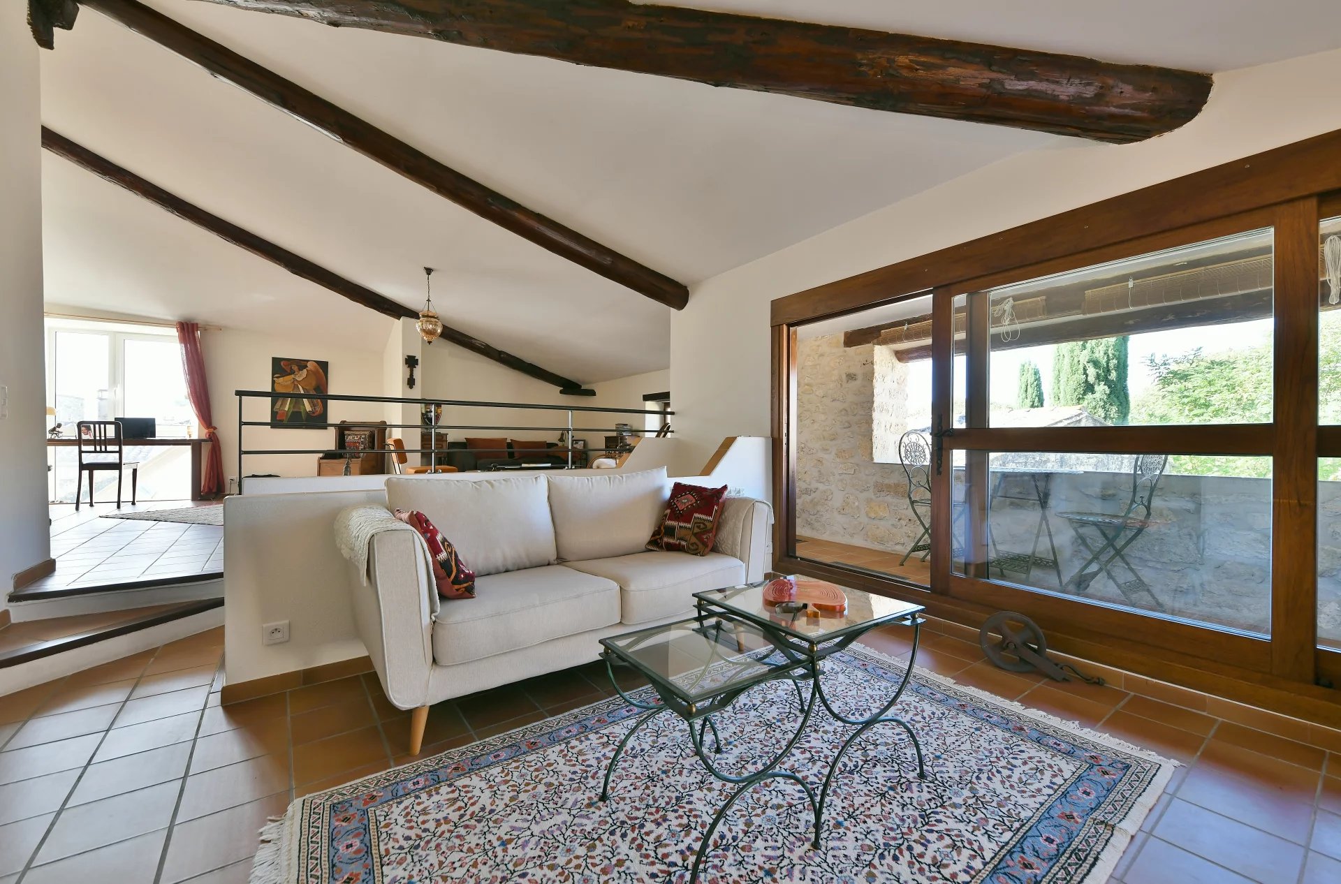 Le deuxième étage offre un salon aux volumes uniques, plus de 38 m² à la belle hauteur sous plafonds ouvert sur une petite terrasse couverte offrant un panorama sur les toits du vieux village.