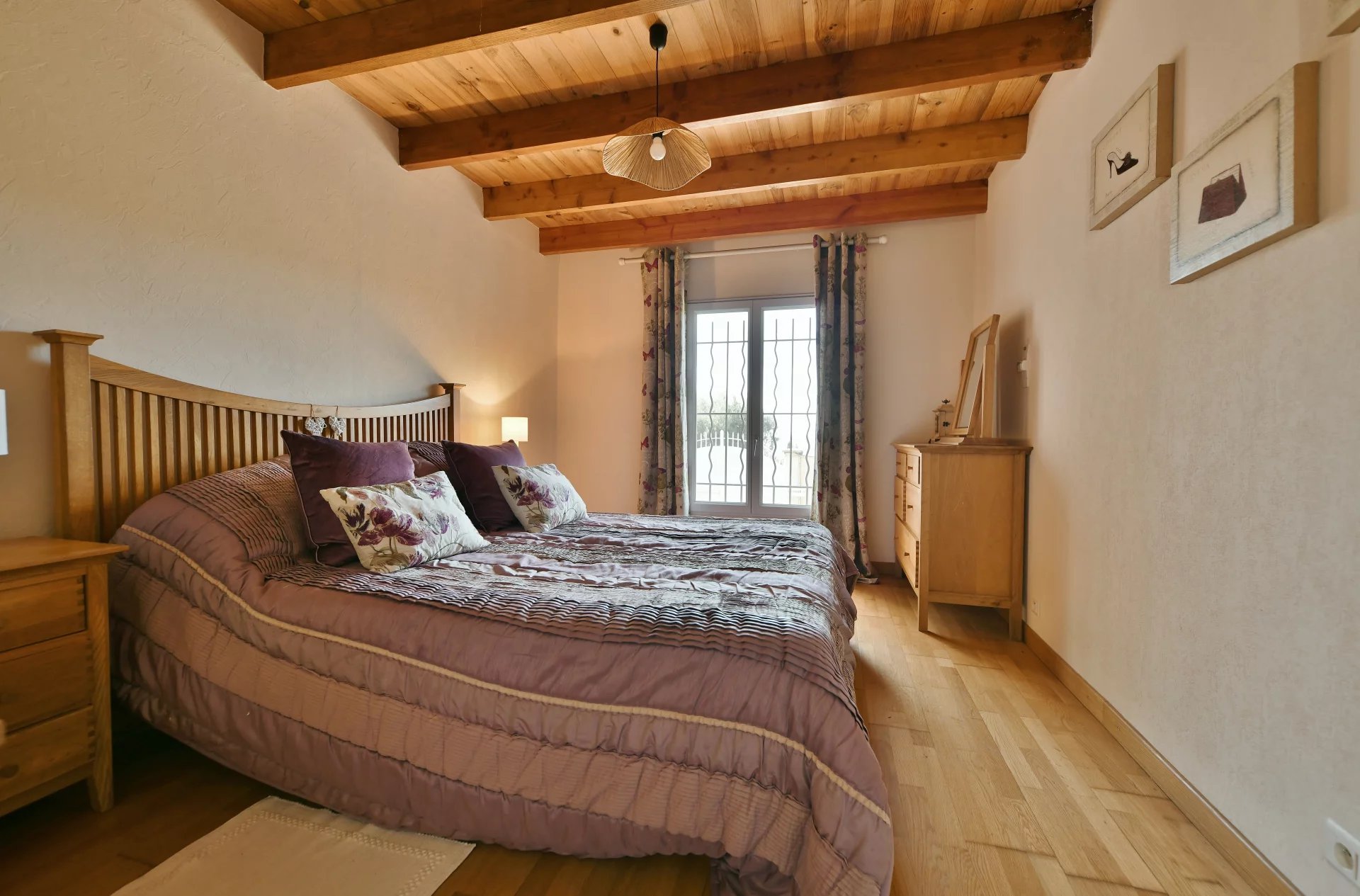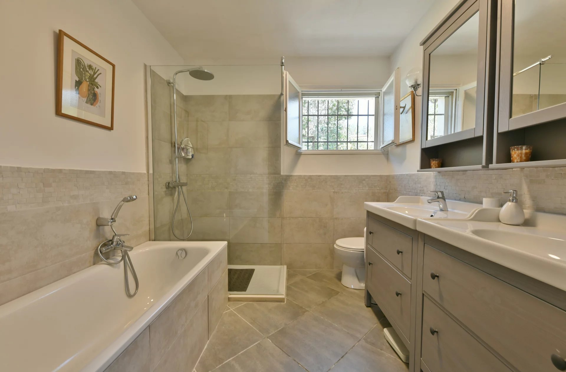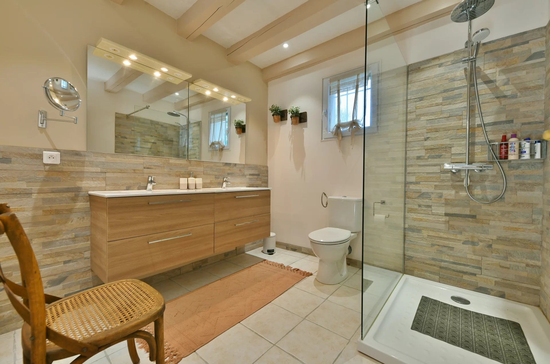 Puis, quelques marches plus bas, de plain-pied avec le jardin, une grande suite parentale (27 m²) avec douche à l’italienne, une double vasque et des toilettes. Une troisième chambre et une salle de bain avec douche, vasque et toilettes.