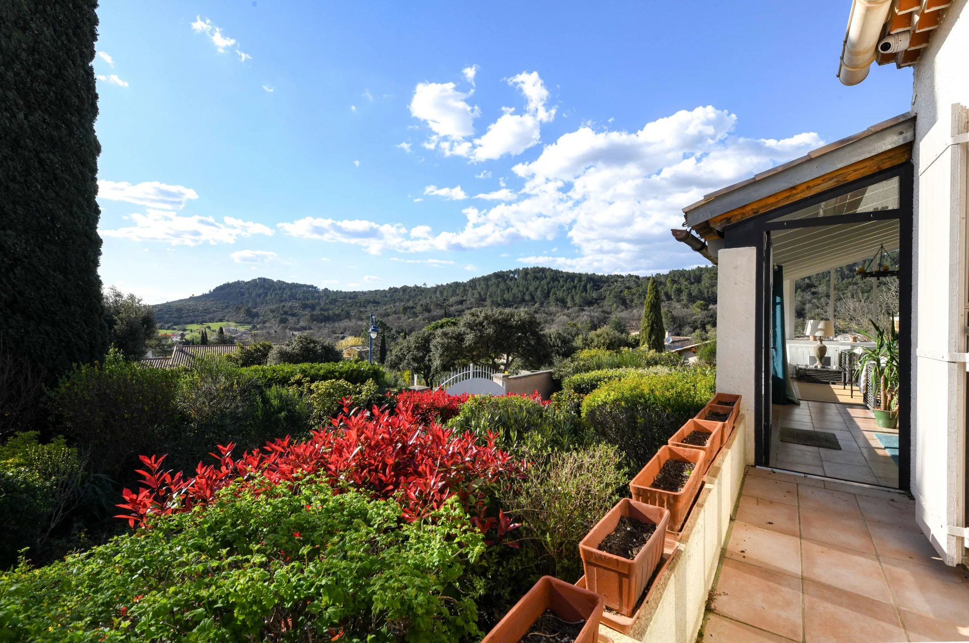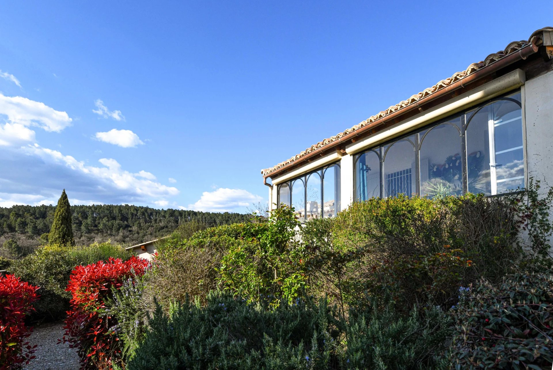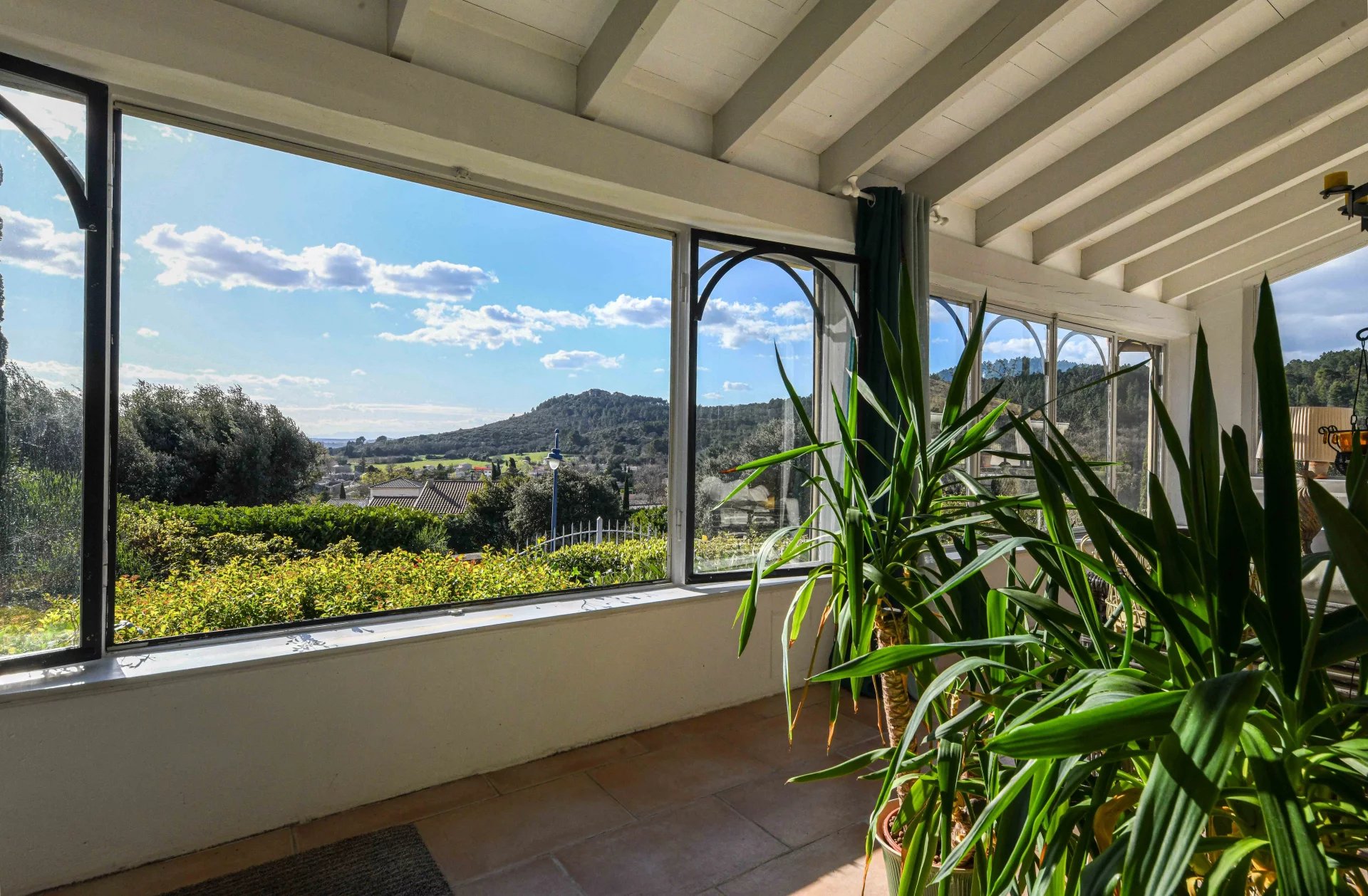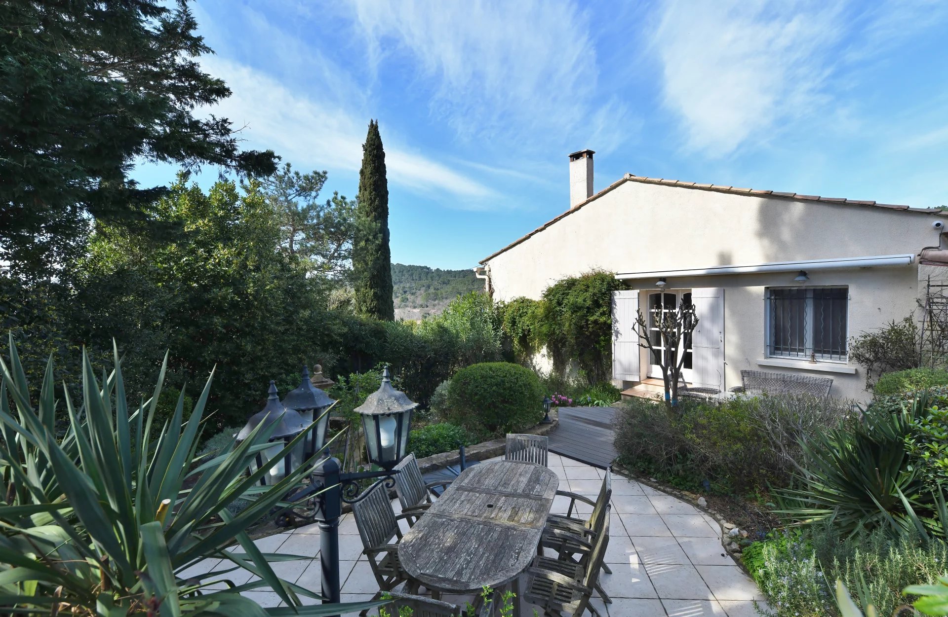 Idéalement implantée sur un terrain de 1 290 m² agrémenté de beaux arbres matures, d’arbustes et de plantes méditerranéennes, la maison accueille ses visiteurs avec une grande véranda lumineuse, l’endroit idéal pour profiter de la vue autour d’un apéritif ou d’un bon livre.