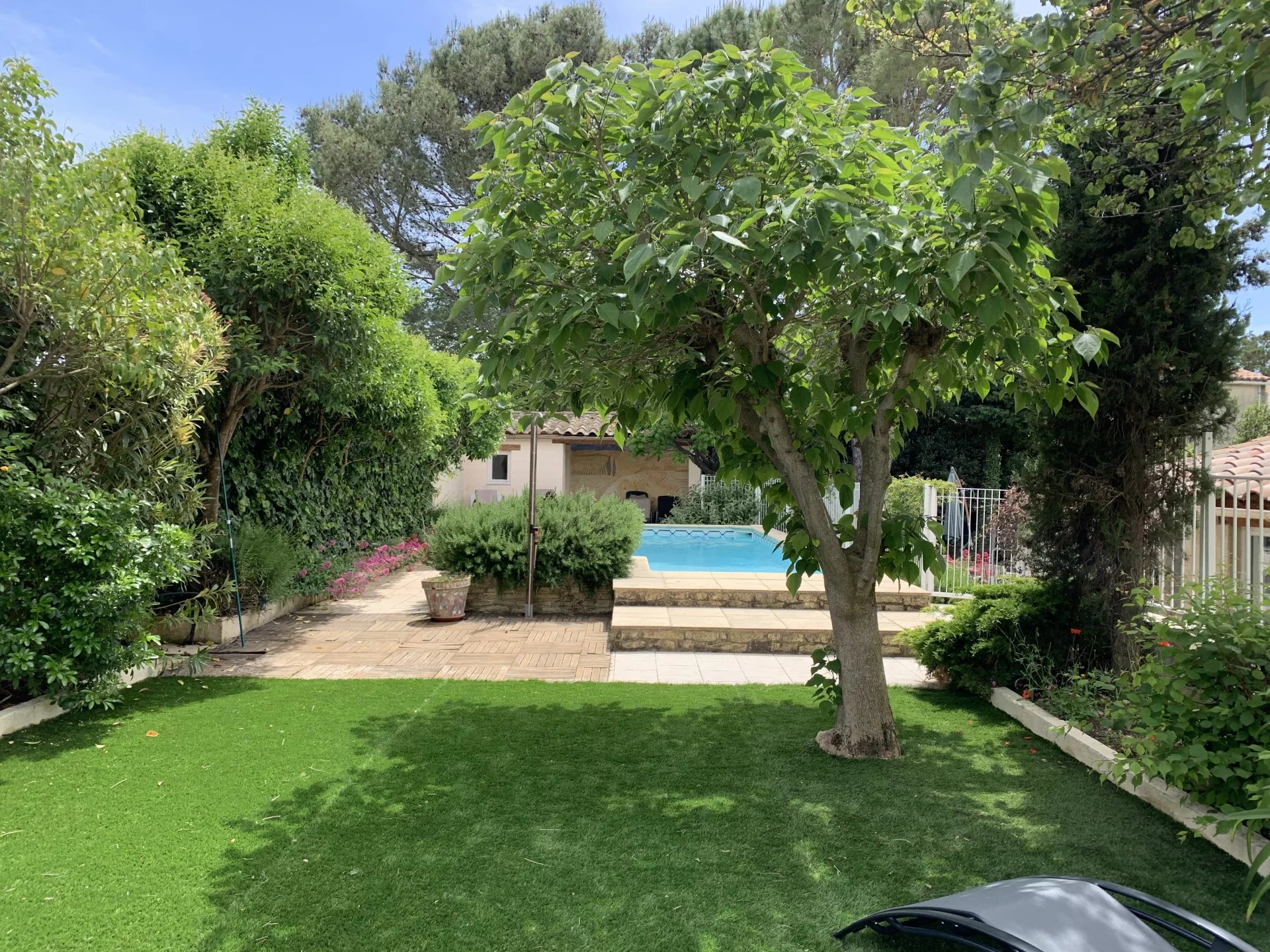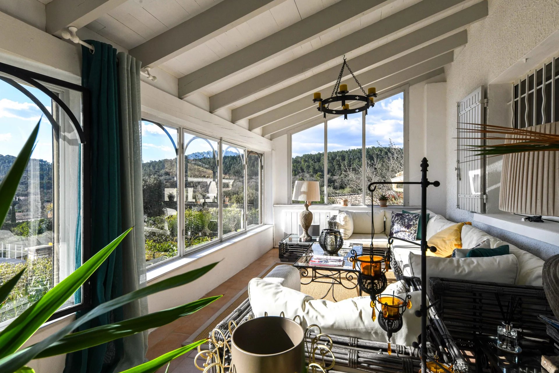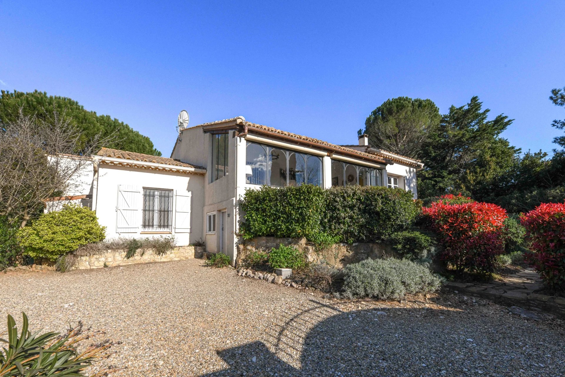 Idéalement implantée sur un terrain de 1 290 m² agrémenté de beaux arbres matures, d’arbustes et de plantes méditerranéennes, la maison accueille ses visiteurs avec une grande véranda lumineuse, l’endroit idéal pour profiter de la vue autour d’un apéritif ou d’un bon livre.