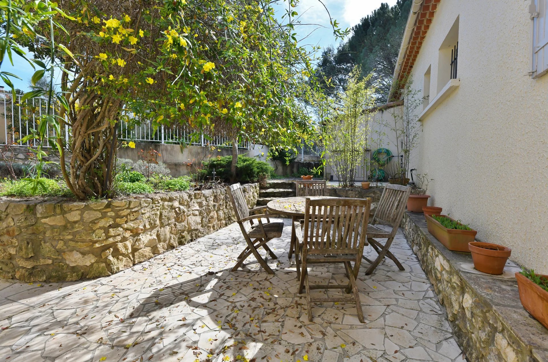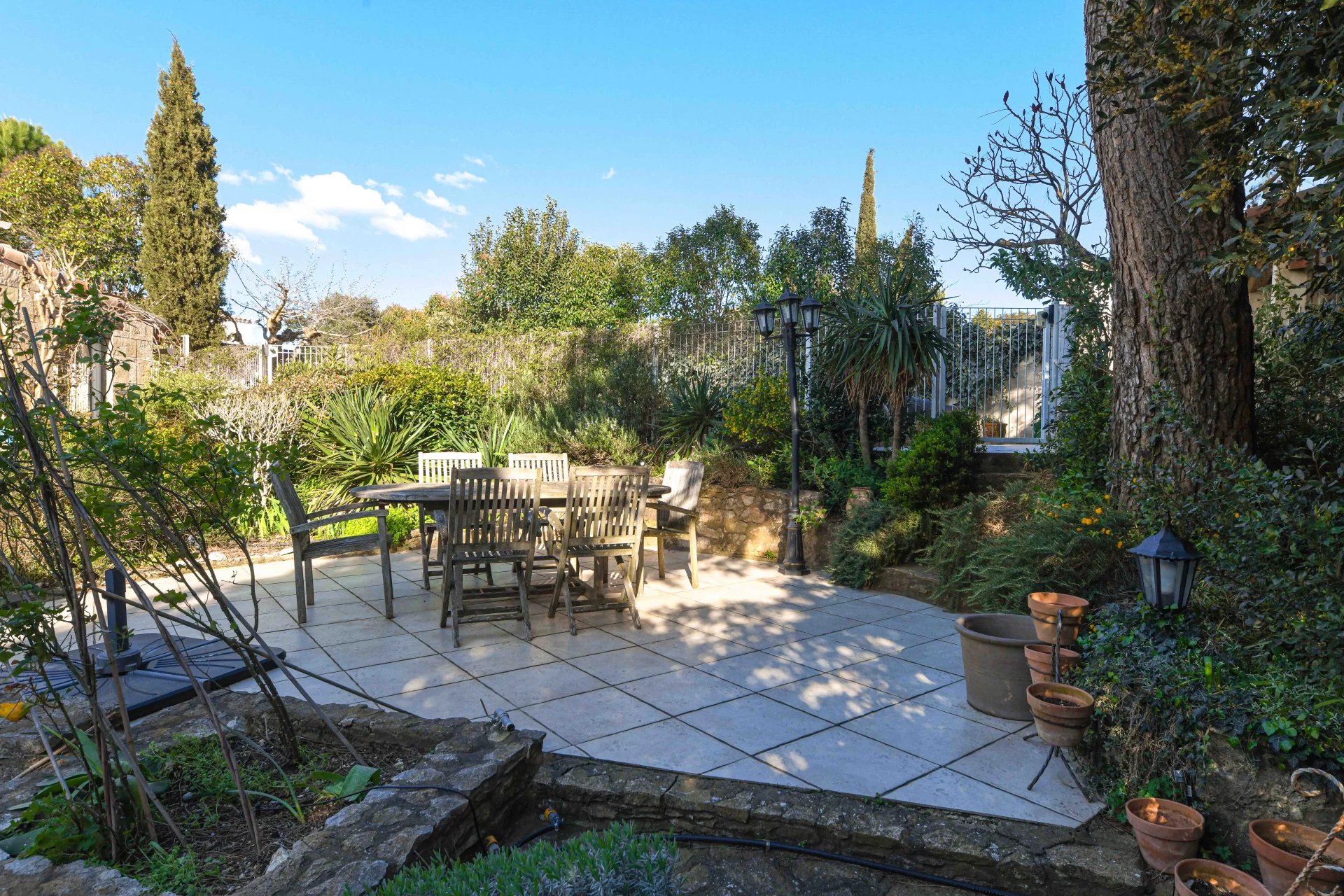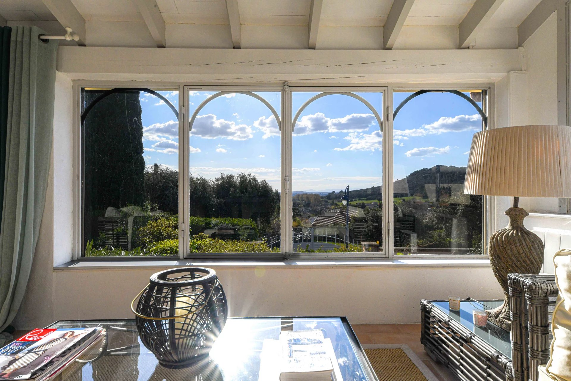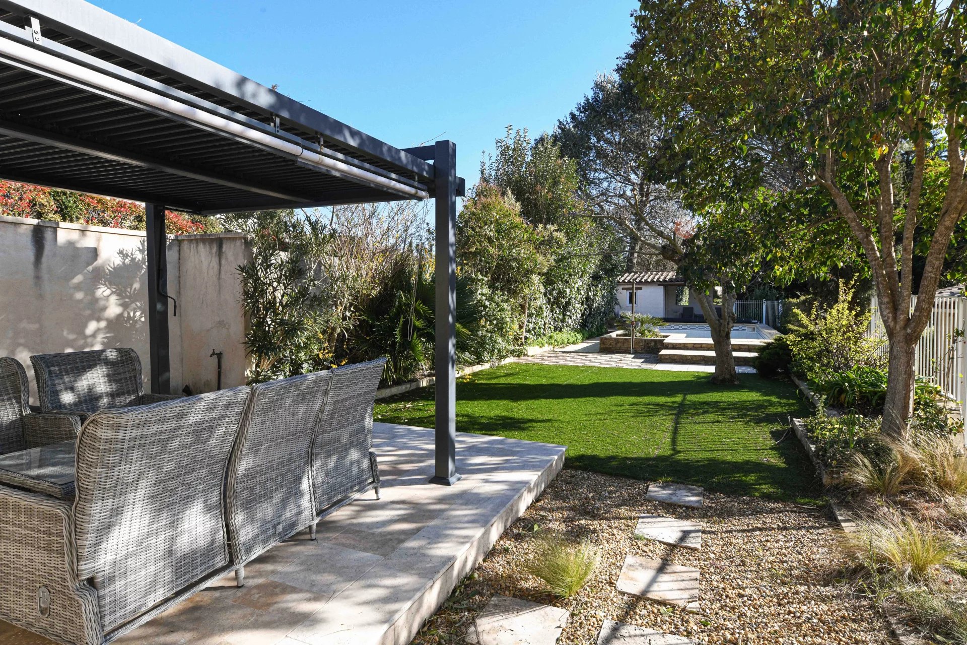 Idéalement implantée sur un terrain de 1 290 m² agrémenté de beaux arbres matures, d’arbustes et de plantes méditerranéennes, la maison accueille ses visiteurs avec une grande véranda lumineuse, l’endroit idéal pour profiter de la vue autour d’un apéritif ou d’un bon livre.