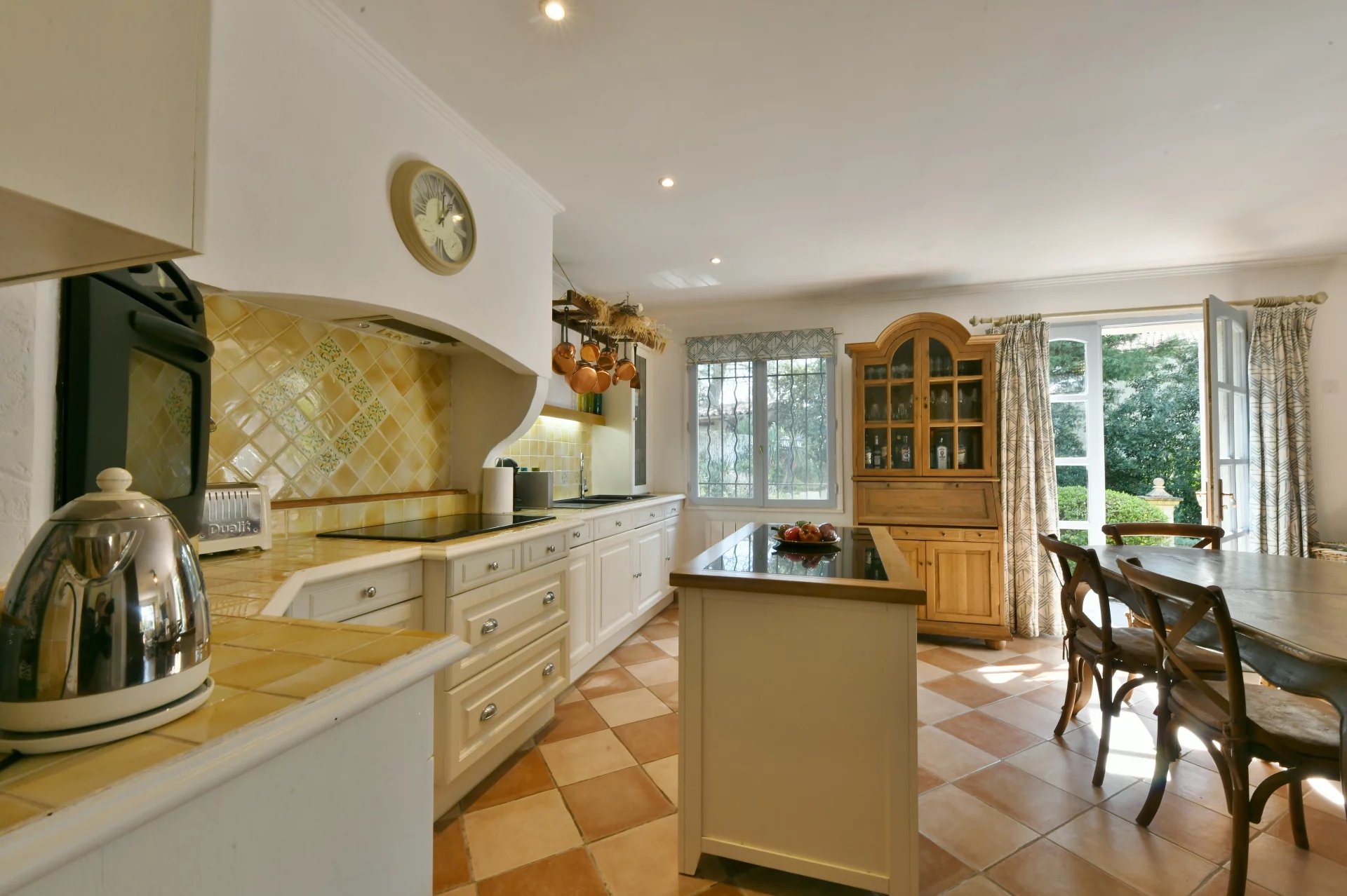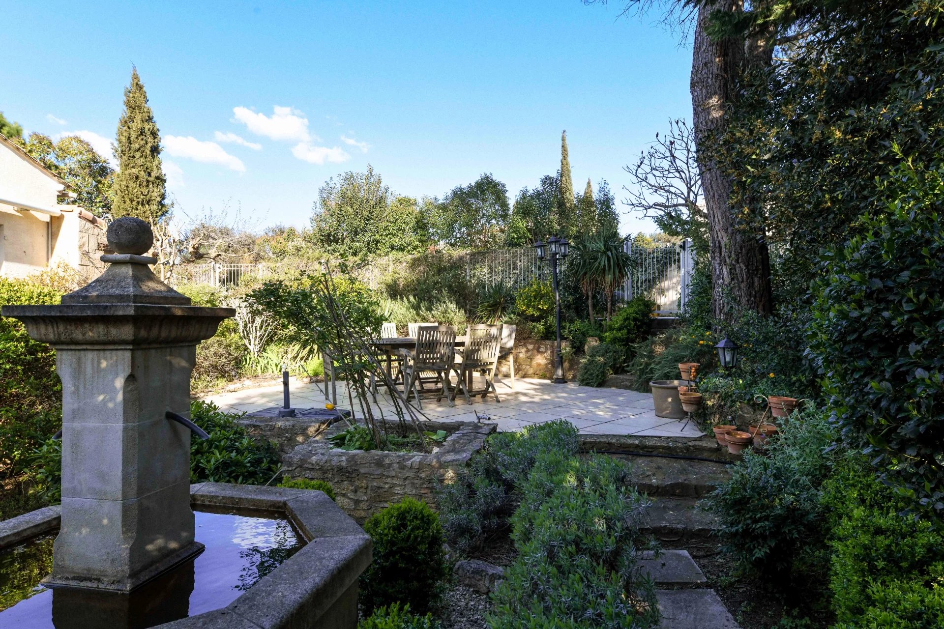 À ce niveau, un grand hall d’entrée mène à une cuisine avec cellier/buanderie ouverte sur le salon agrémenté d’une cheminée à insert. Des portes-fenêtres donnant sur la cuisine s’ouvrent sur une charmante terrasse latérale avec une fontaine (store électrique).