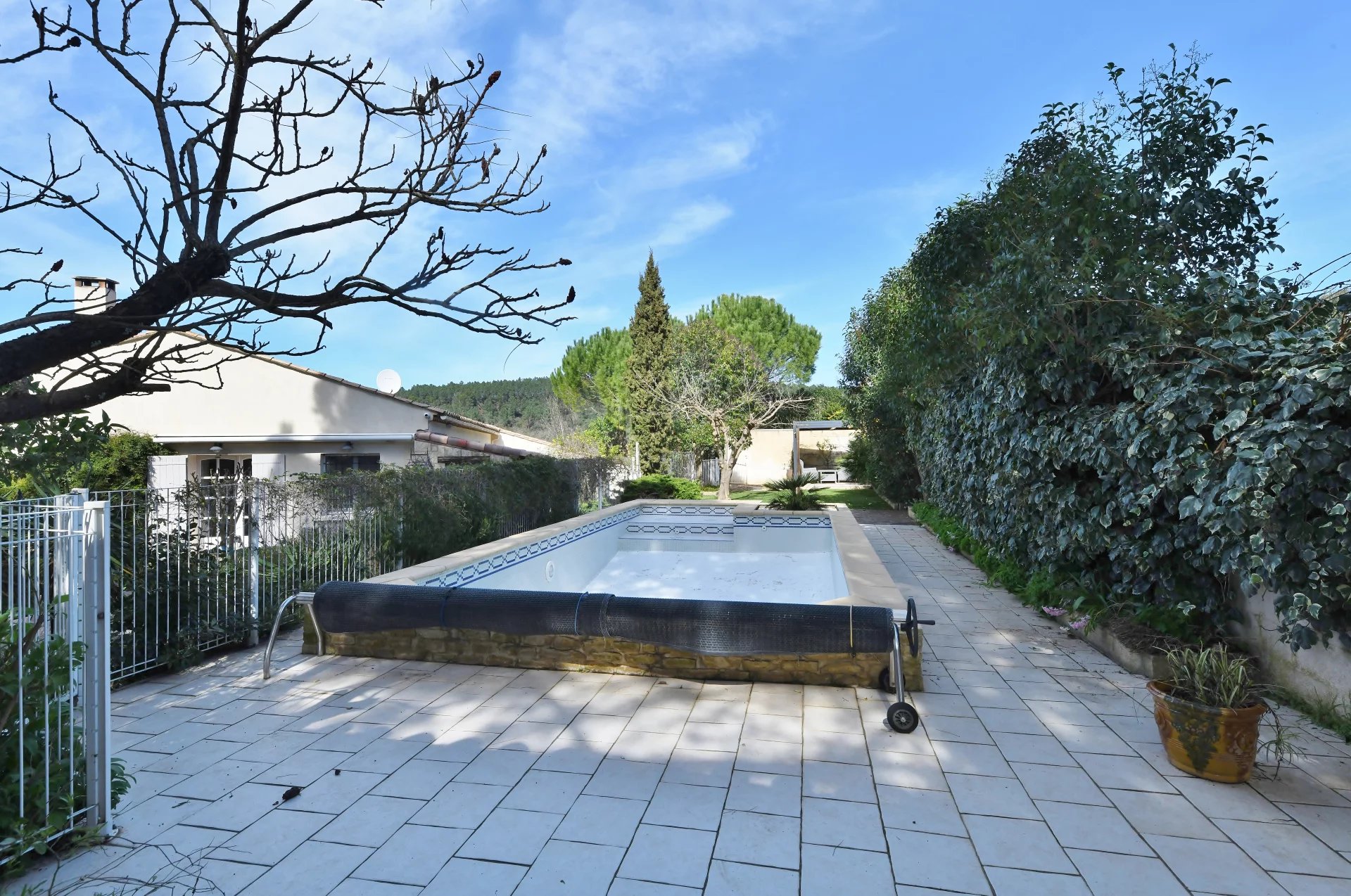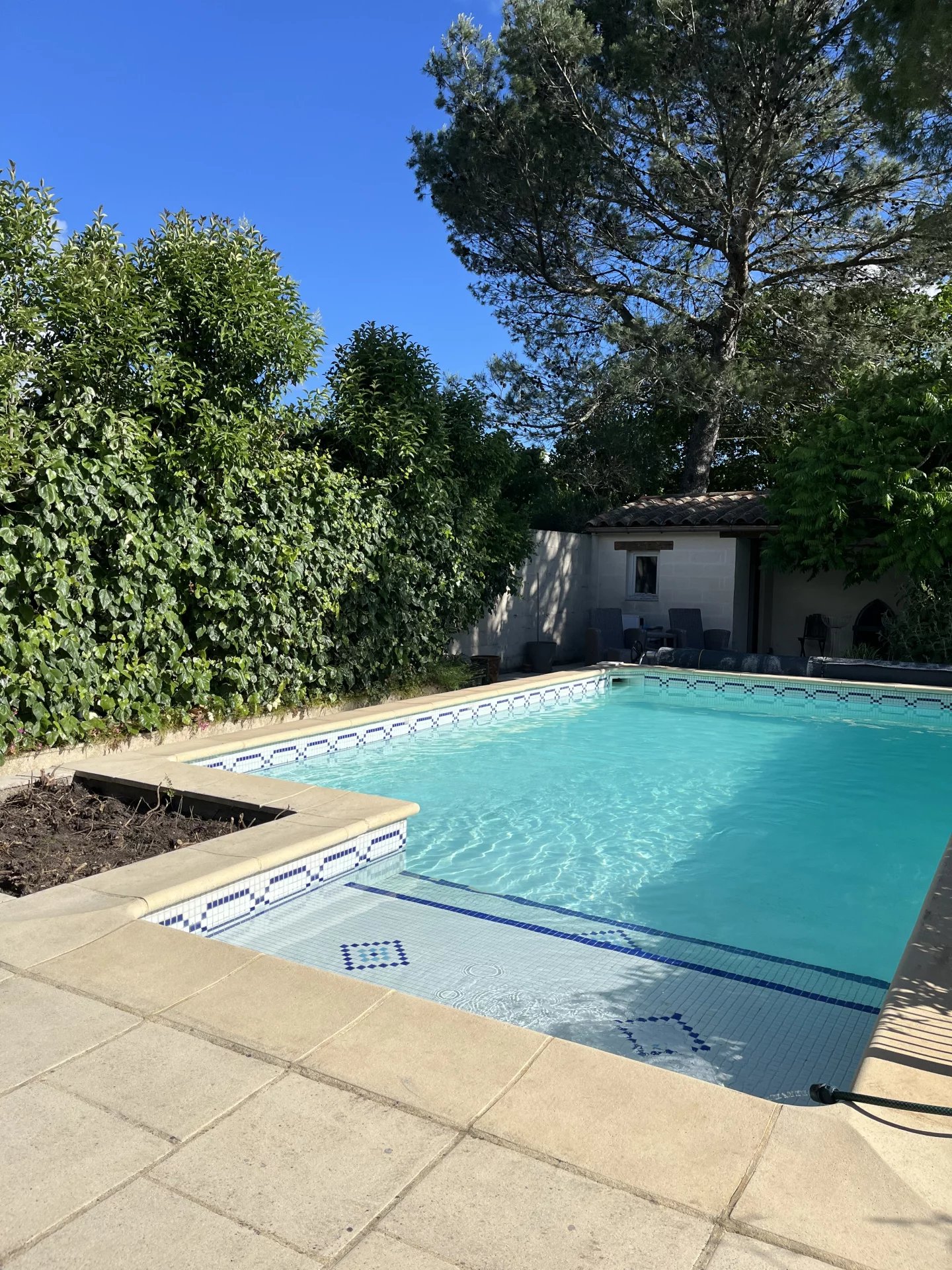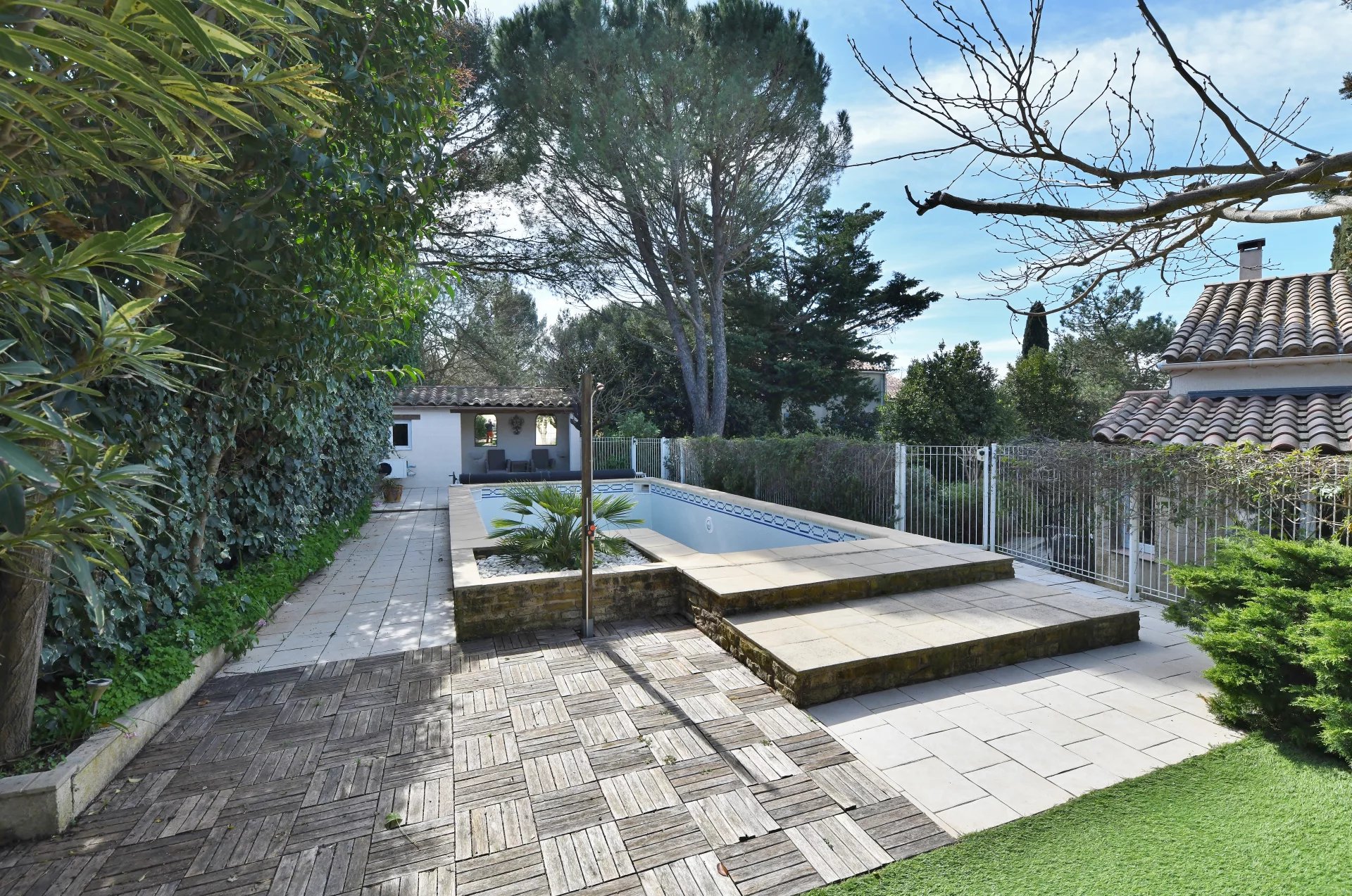 Plusieurs terrasses autour de la maison et du jardin. Une belle piscine (8×4) équipée d’une pompe à chaleur, garantissant une saison de baignade prolongée. Une terrasse bioclimatique complète les espaces extérieurs.
