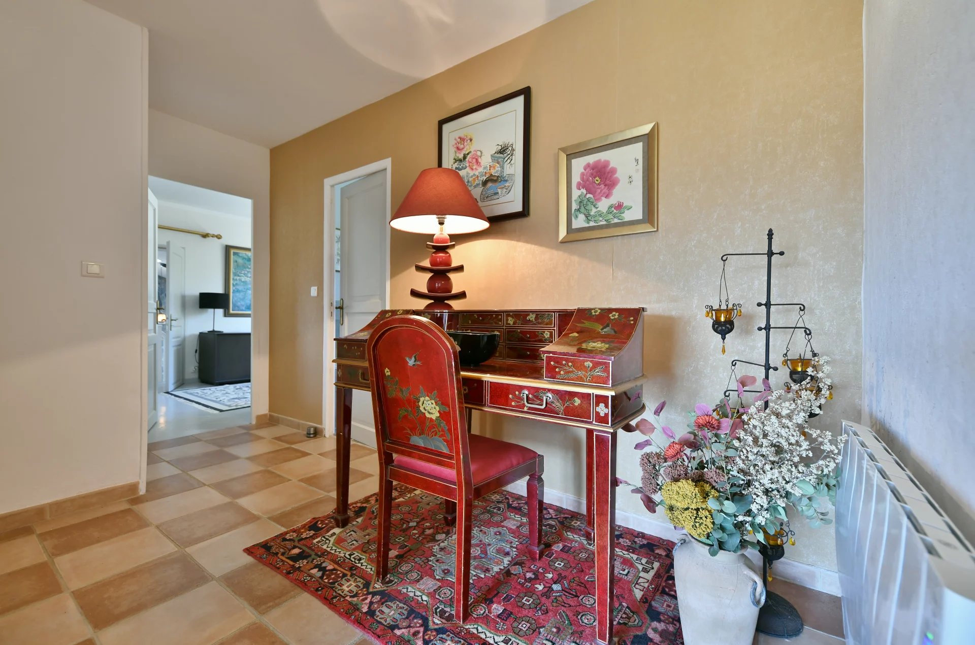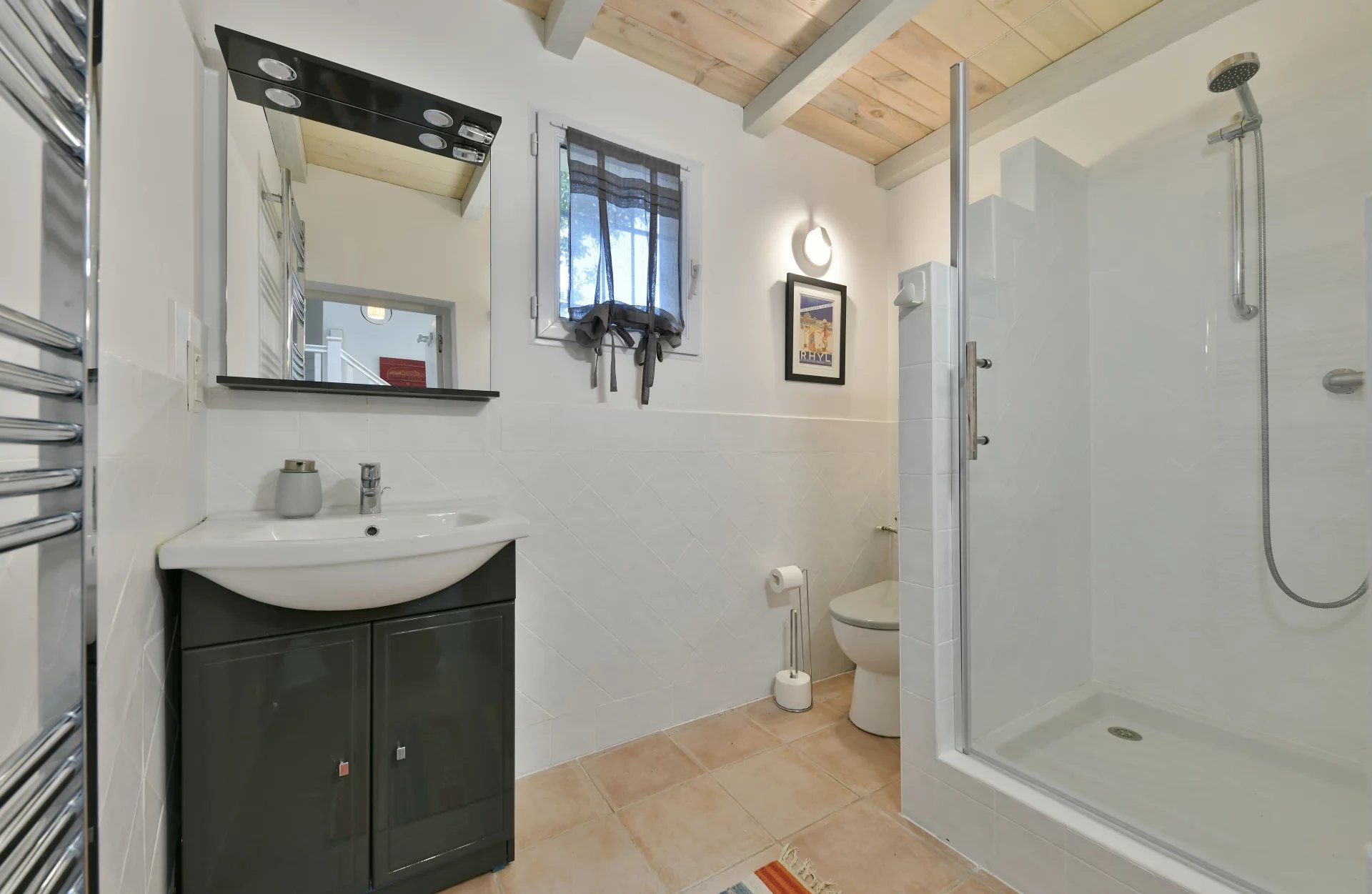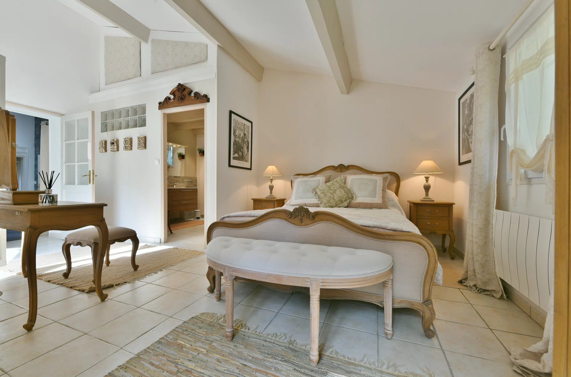 De plain-pied avec les pièces de réception, une chambre avec de grands placards intégrés ; une salle de bains avec douche, baignoire et double vasque. Des toilettes pour invités, ainsi qu’un bureau (qui pourrait facilement être transformé en chambre).