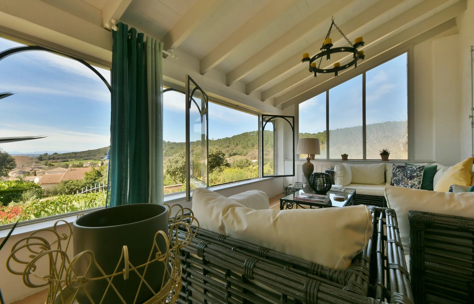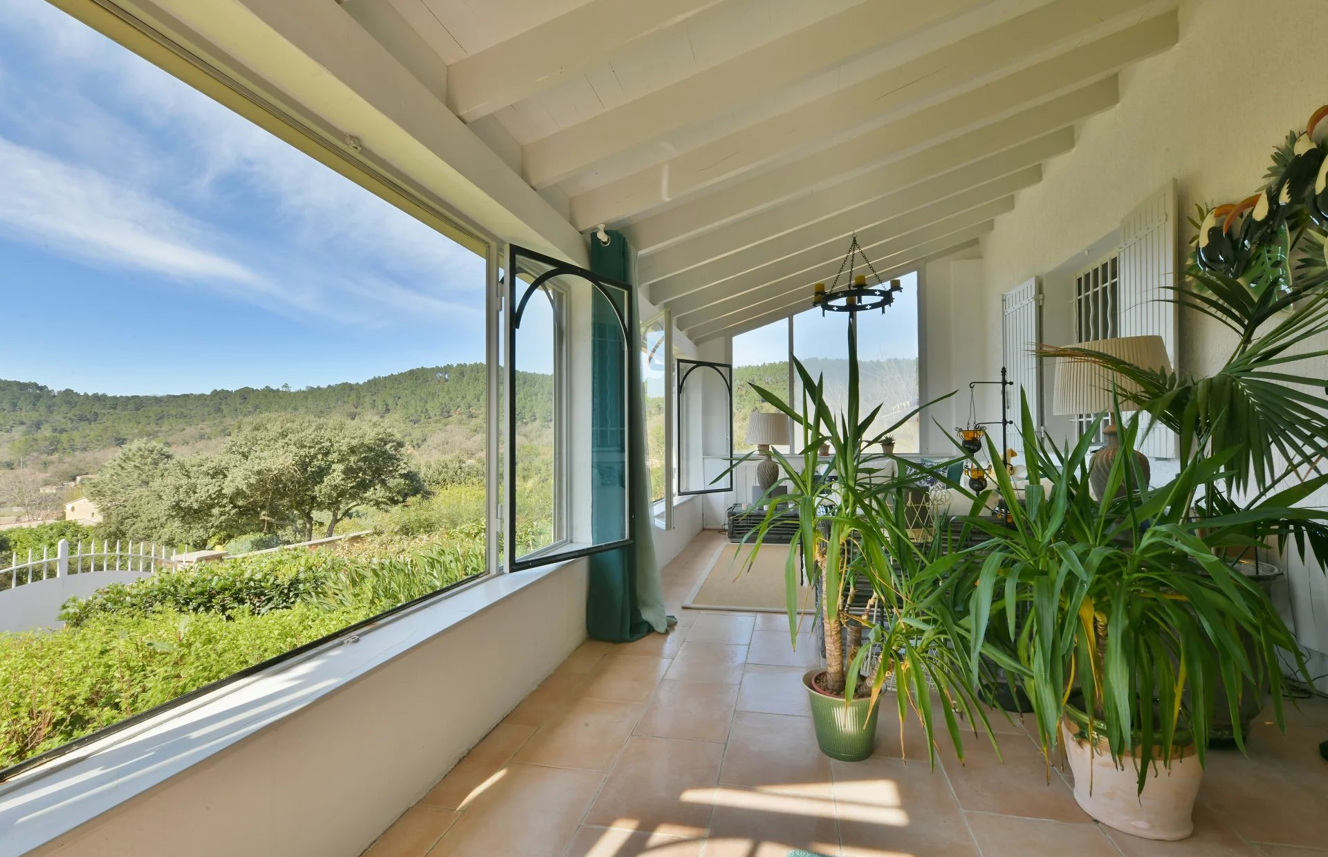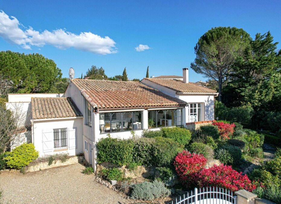 Idéalement implantée sur un terrain de 1 290 m² agrémenté de beaux arbres matures, d’arbustes et de plantes méditerranéennes, la maison accueille ses visiteurs avec une grande véranda lumineuse, l’endroit idéal pour profiter de la vue autour d’un apéritif ou d’un bon livre.