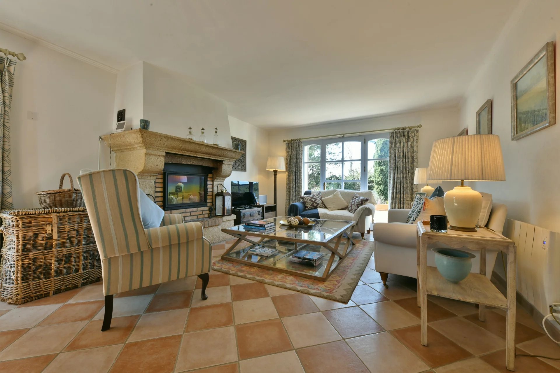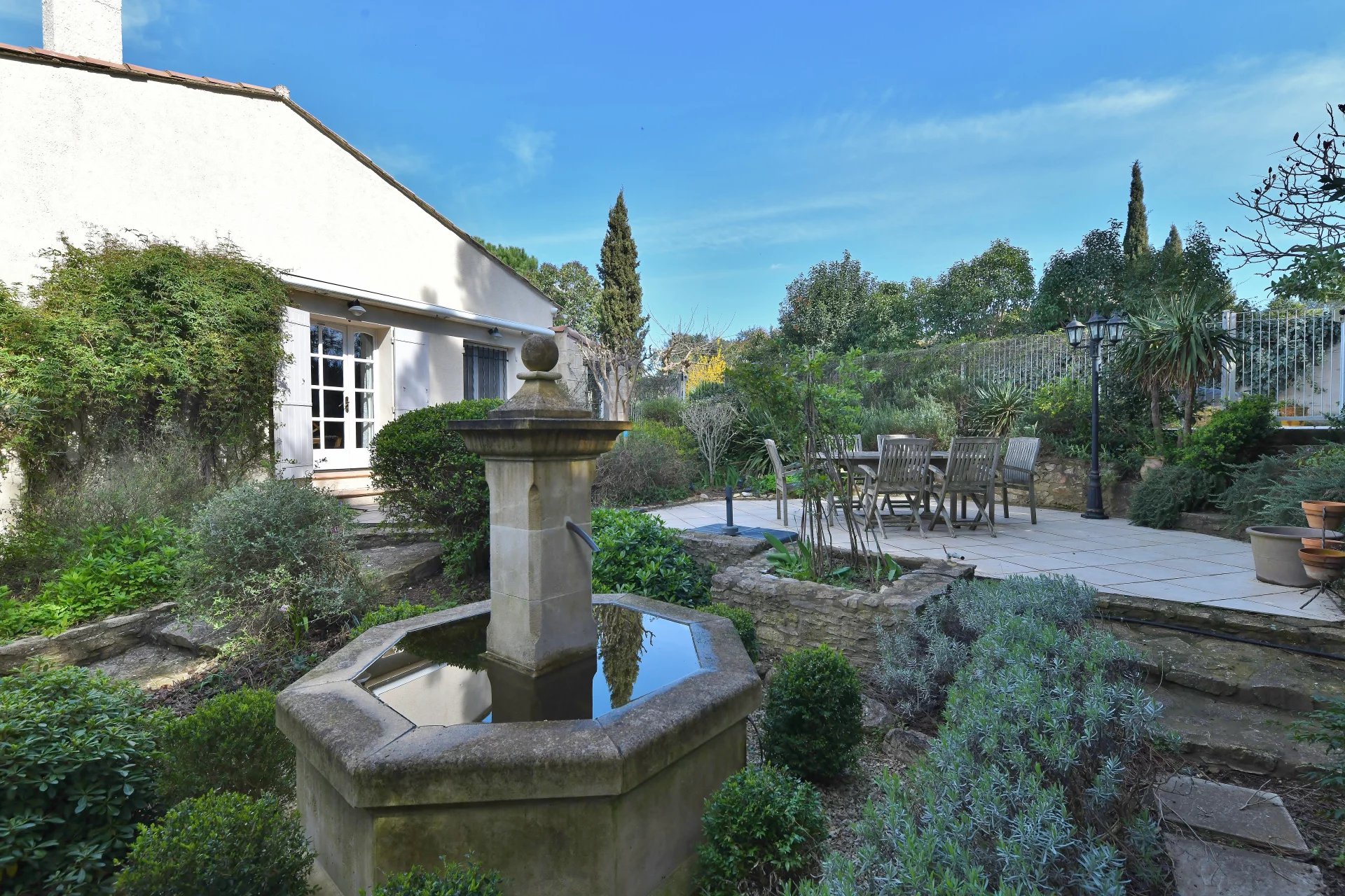 À ce niveau, un grand hall d’entrée mène à une cuisine avec cellier/buanderie ouverte sur le salon agrémenté d’une cheminée à insert. Des portes-fenêtres donnant sur la cuisine s’ouvrent sur une charmante terrasse latérale avec une fontaine (store électrique).