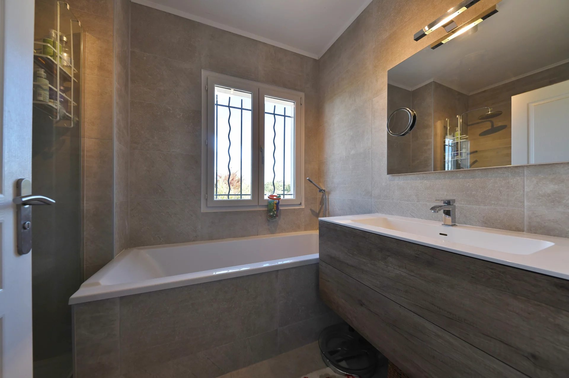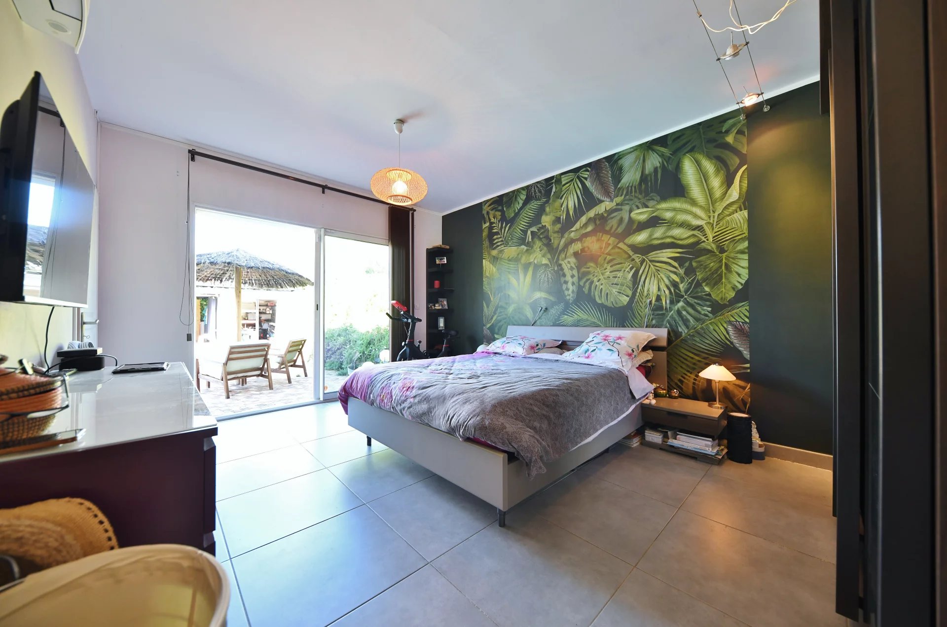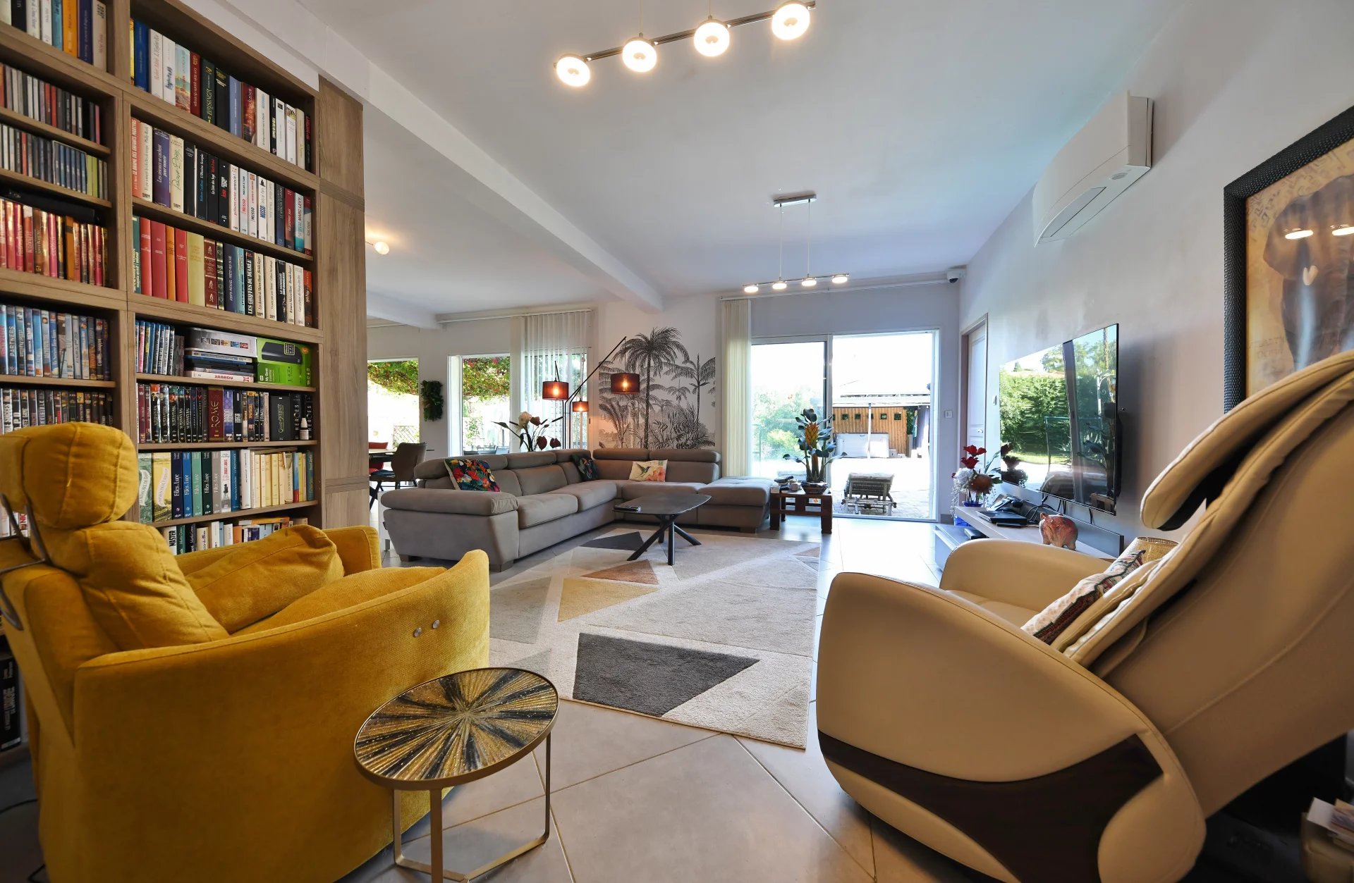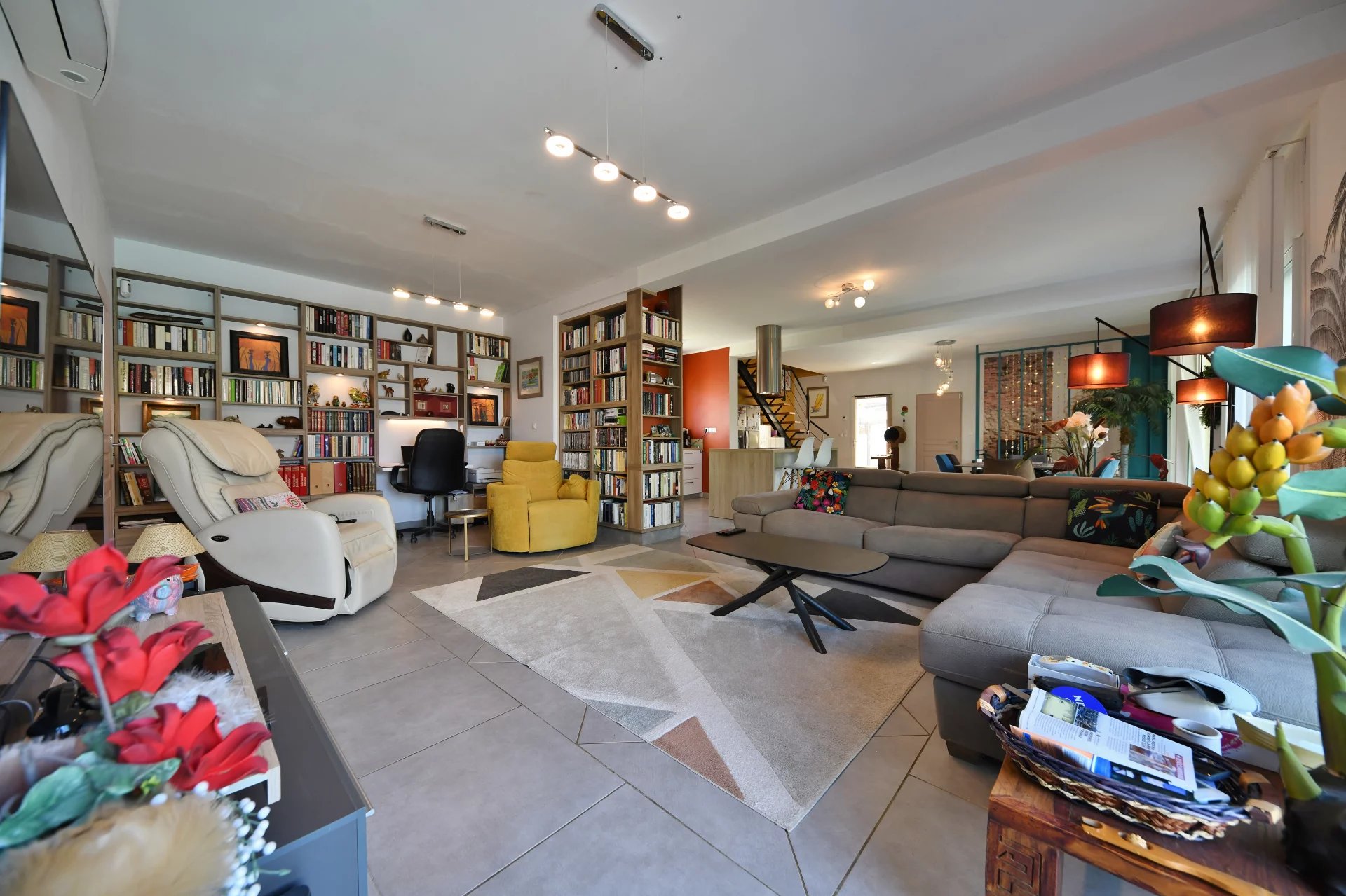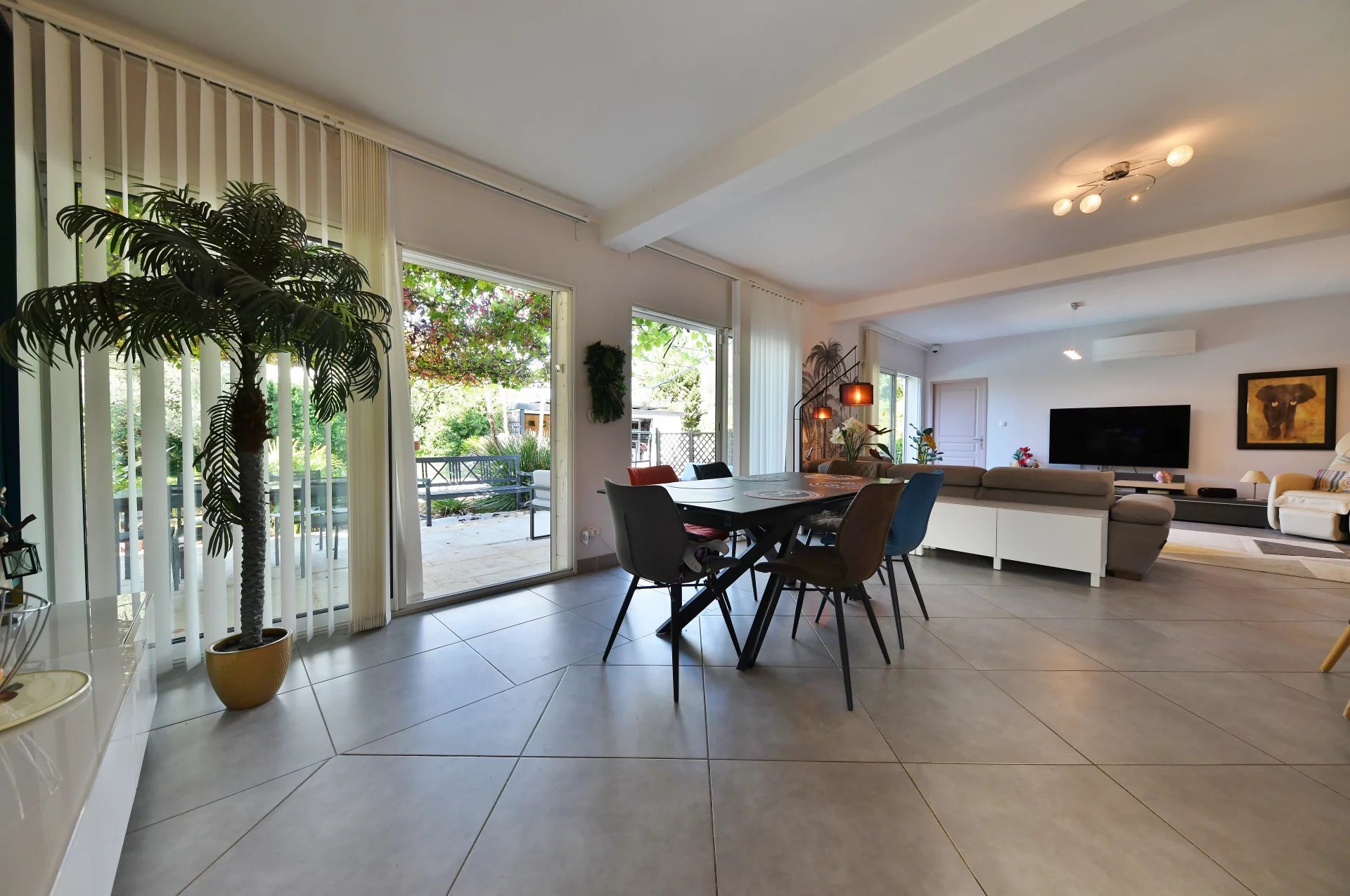 Un grand espace de vie lumineux, de superficie 70m² environ, cuisine ouverte équipée d’éléments de bonne facture, salle à manger et salon, ouvrant sur une terrasse exposée Sud offrant une vue sur le jardin et la piscine.