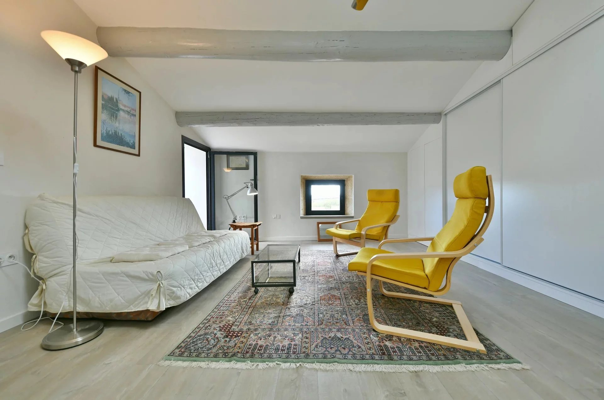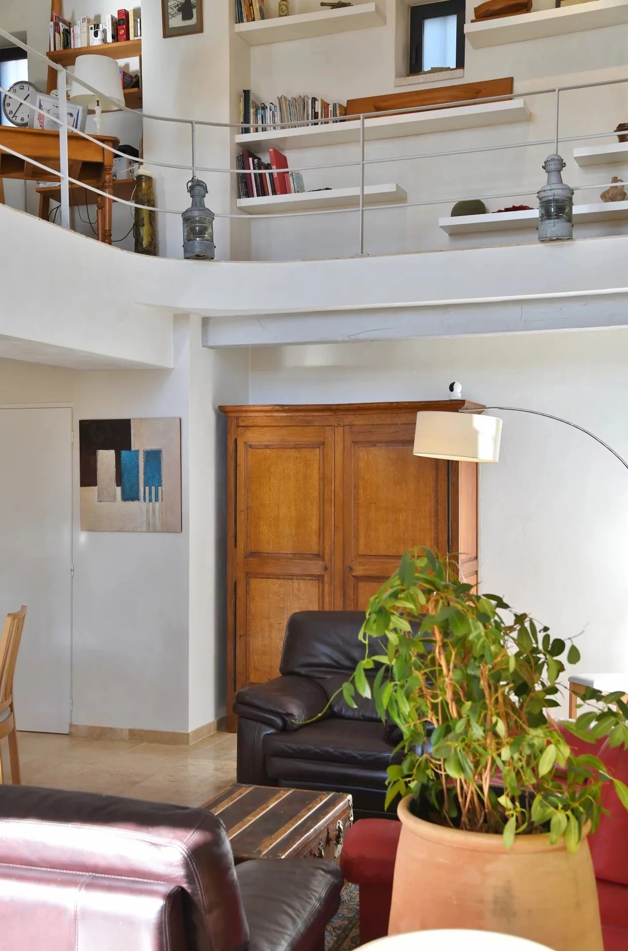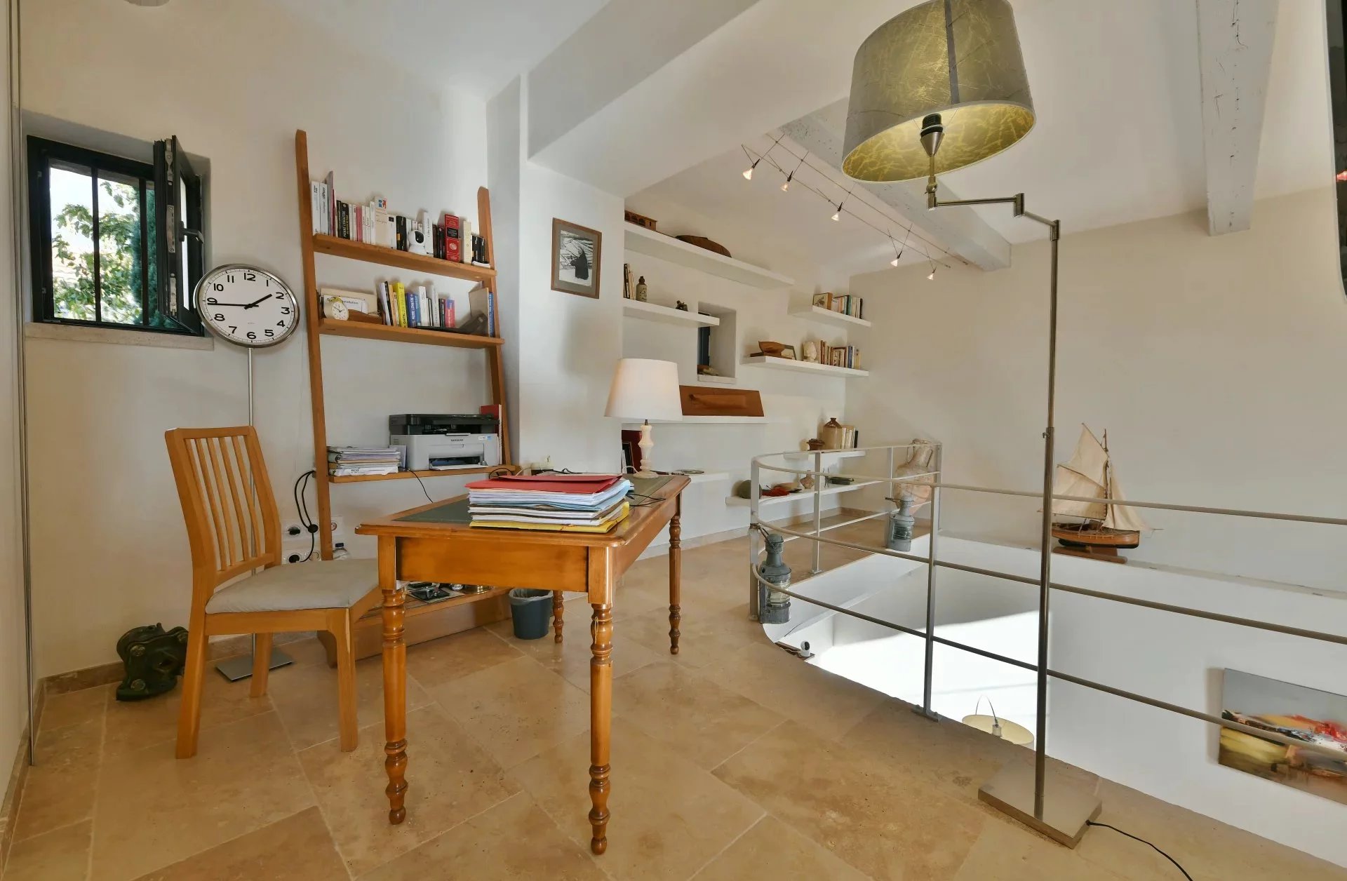 Au premier étage, une suite spacieuse offre une belle vue sur la cour, les toits et les collines, et comprend chambre, bureau et salle de bains.