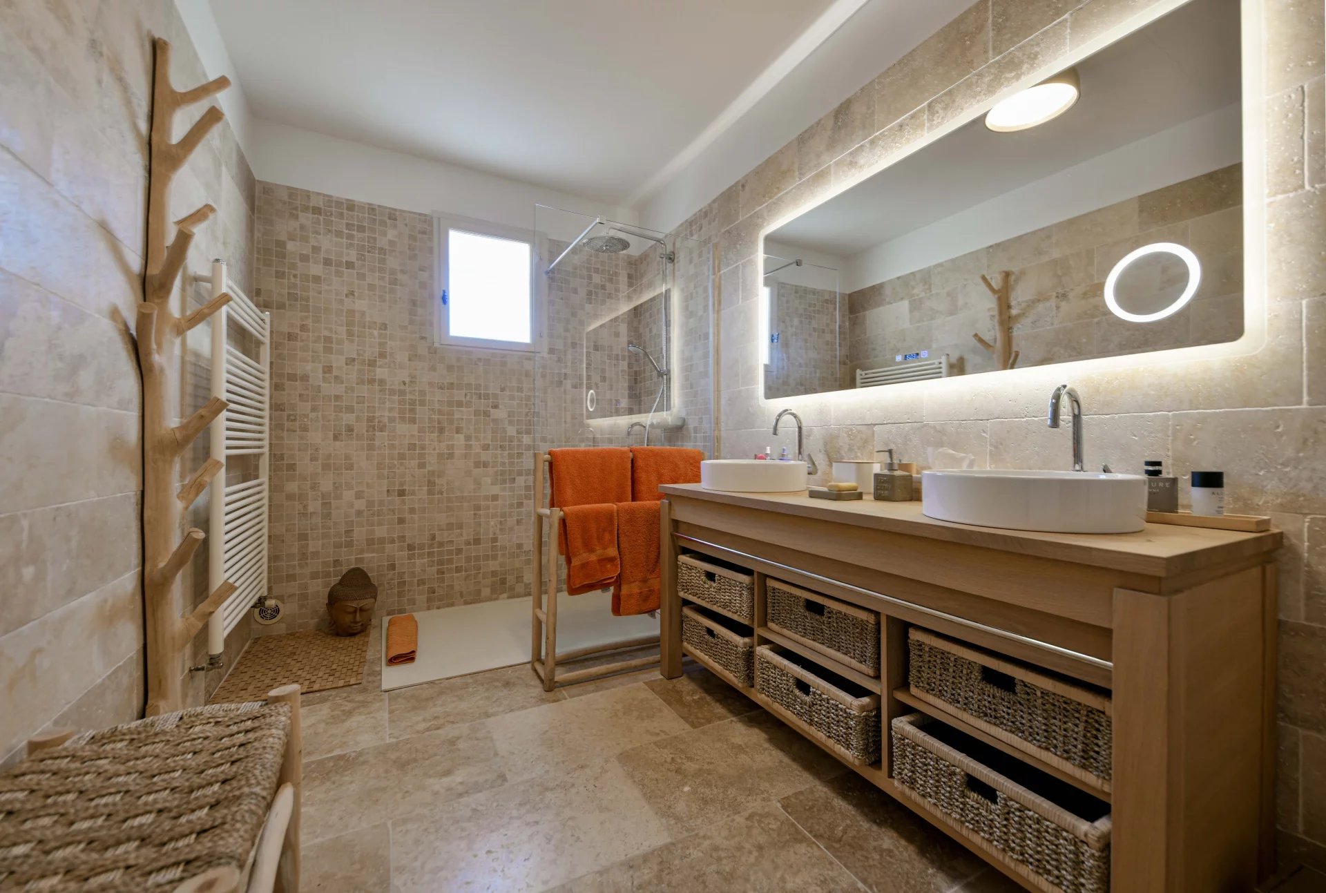 Le jardin de 503 m² offre un bel espace piscine (7 x 3.50m, filtration au sel) et est arboré avec des essences d’arbres et d’arbustes méridionales (arrosage automatique et éclairage).