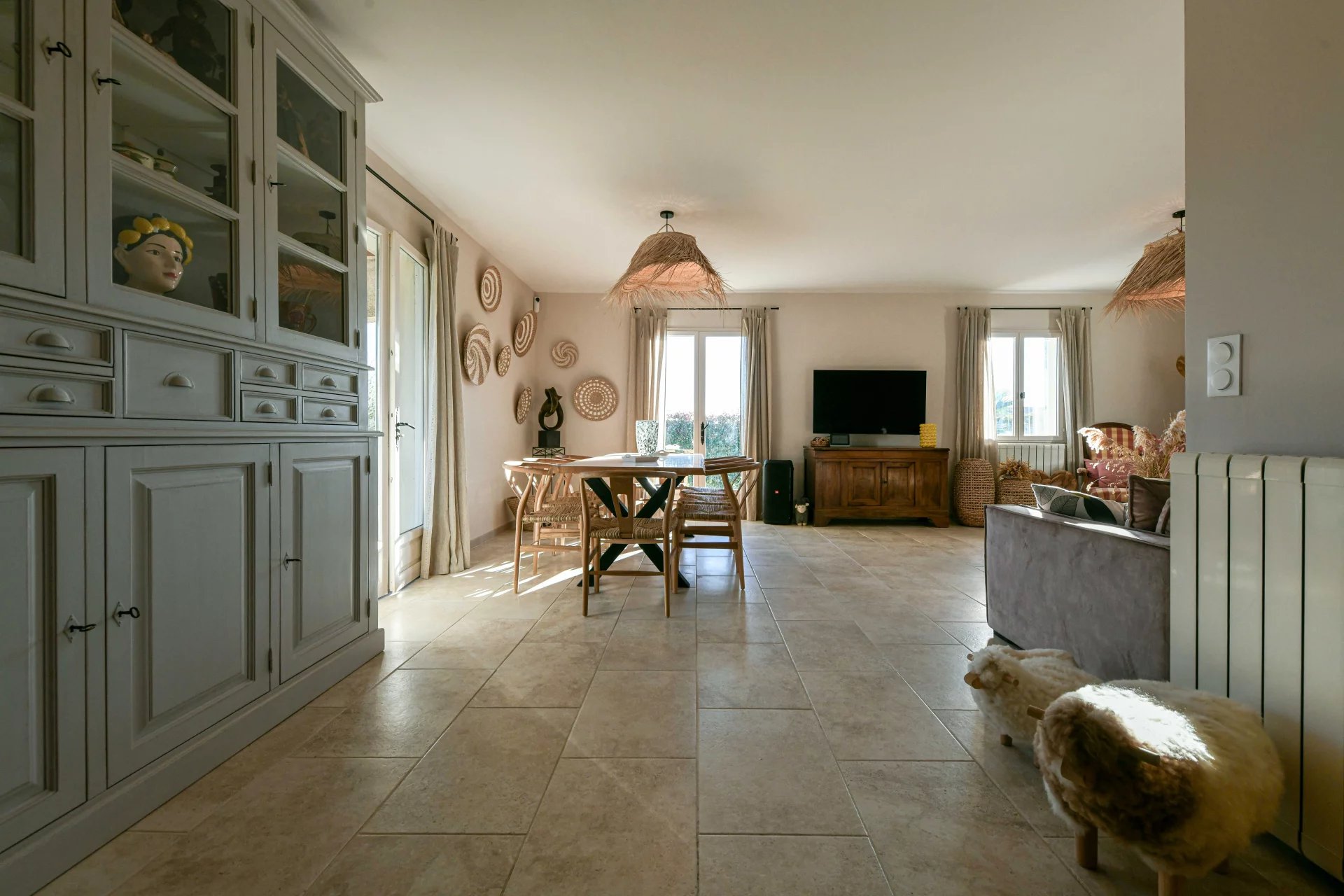La pièce de vie de 50 m² à triple expositions offre un bel espace salon, ainsi qu’un espace salle à manger tous deux ouverts par de larges portes fenêtres sur la terrasse ombragée, le jardin et la piscine.