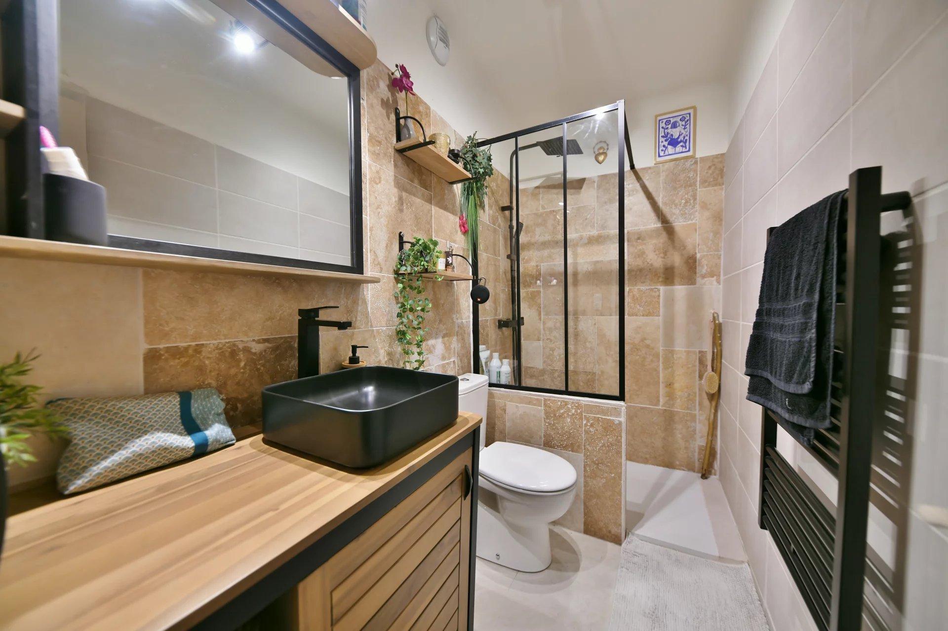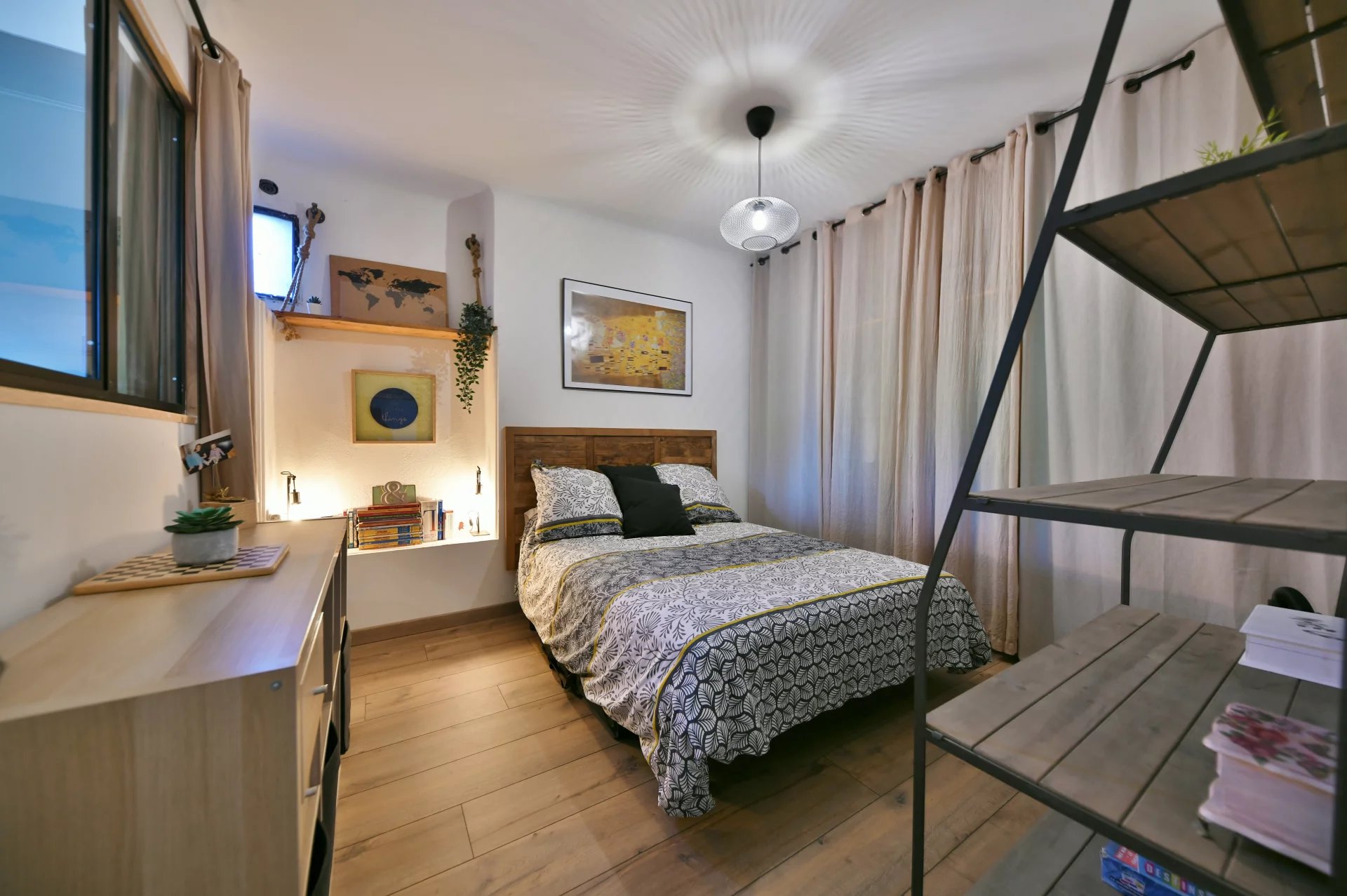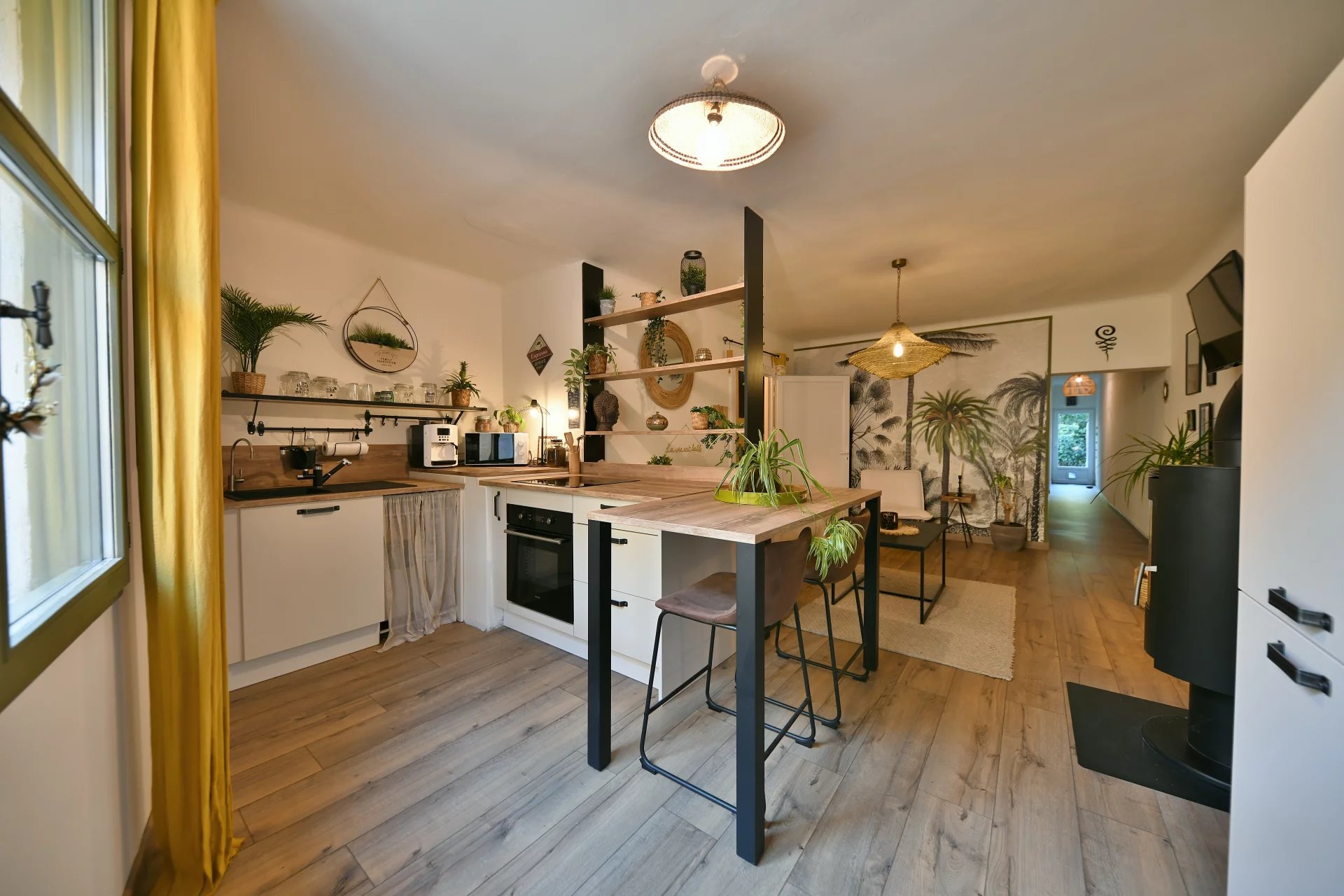 Au deuxième étage, le palier ouvre sur un second espace de vie confortable, un salon avec poêle à bois et un espace cuisine équipée avec un îlot central. Depuis le palier un accès à deux chambres (l’une propose un balcon surplombant la cour) et une salle d’eau.