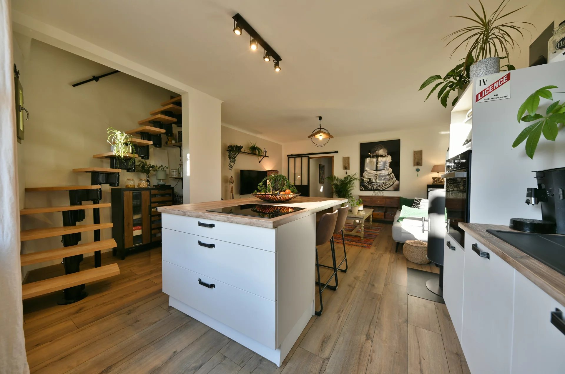 Au deuxième étage, le palier ouvre sur un second espace de vie confortable, un salon avec poêle à bois et un espace cuisine équipée avec un îlot central. Depuis le palier un accès à deux chambres (l’une propose un balcon surplombant la cour) et une salle d’eau.