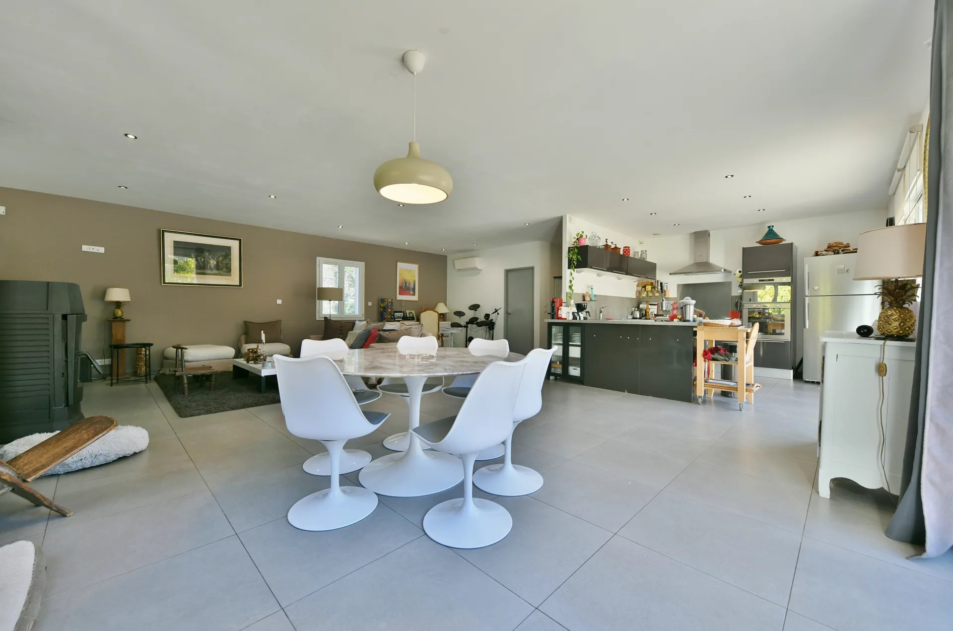 La maison offre une excellente distribution, fluide et confortable. Elle propose une suite parentale composée d’une chambre avec dressing et salle d’eau privative, ainsi que deux autres chambres se partageant une salle de bains équipée d’une douche et d’une baignoire. Le séjour, particulièrement spacieux et lumineux, s’organise autour d’une cuisine ouverte tournée à la fois vers le salon et vers l’extérieur, créant une véritable continuité vers l’extérieur grâce aux larges baies vitrées à galandage donnant sur la terrasse.