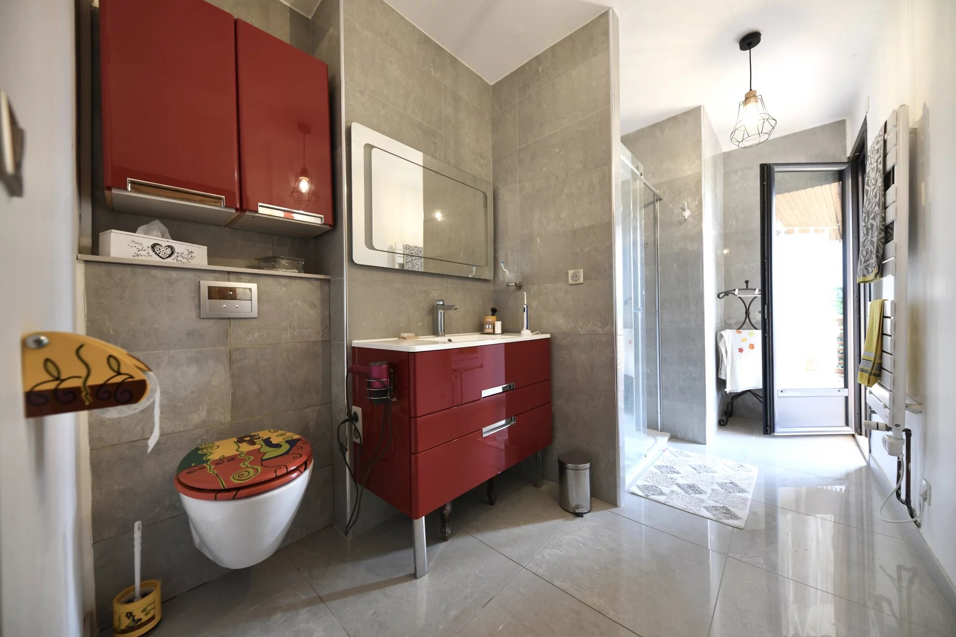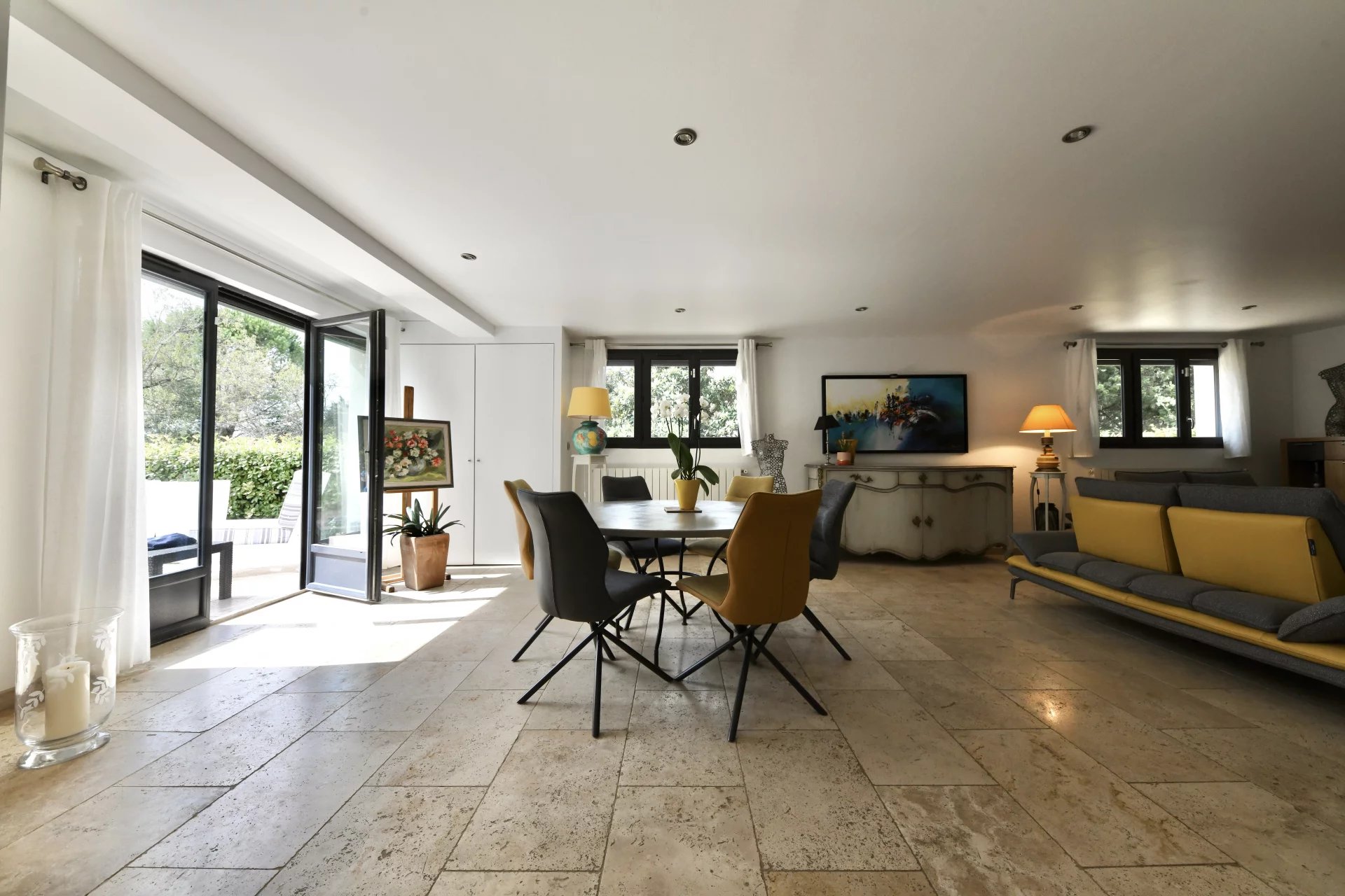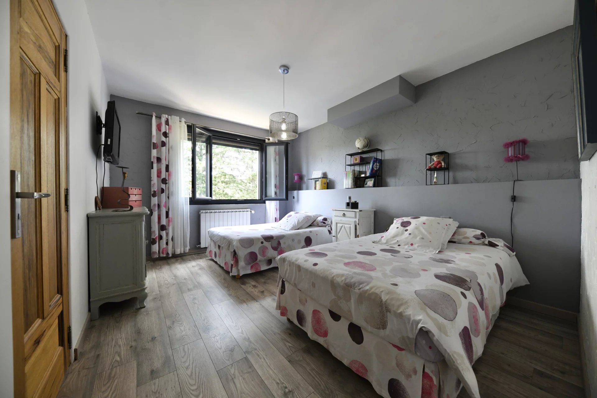 Au rez de chaussée, une spacieuse pièce de vie avec cuisine aménagée ouvrant sur le jardin arboré et la piscine, une chambre, salle d’eau et Wc indépendant, vestiaire et buanderie.