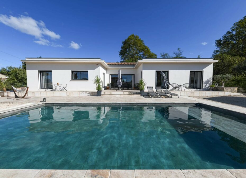 Built in 2021, this property consists of an entrance serving a double living room of 70 m² crossing and bright overlooking the terrace and pool, a kitchen, three spacious bedrooms, one en suite, separate toilet and additional bathroom, Cellar, laundry room and spacious “garage” of 32 m² (heated and insulated) offering the possibility of creating a fourth bedroom or workplace.