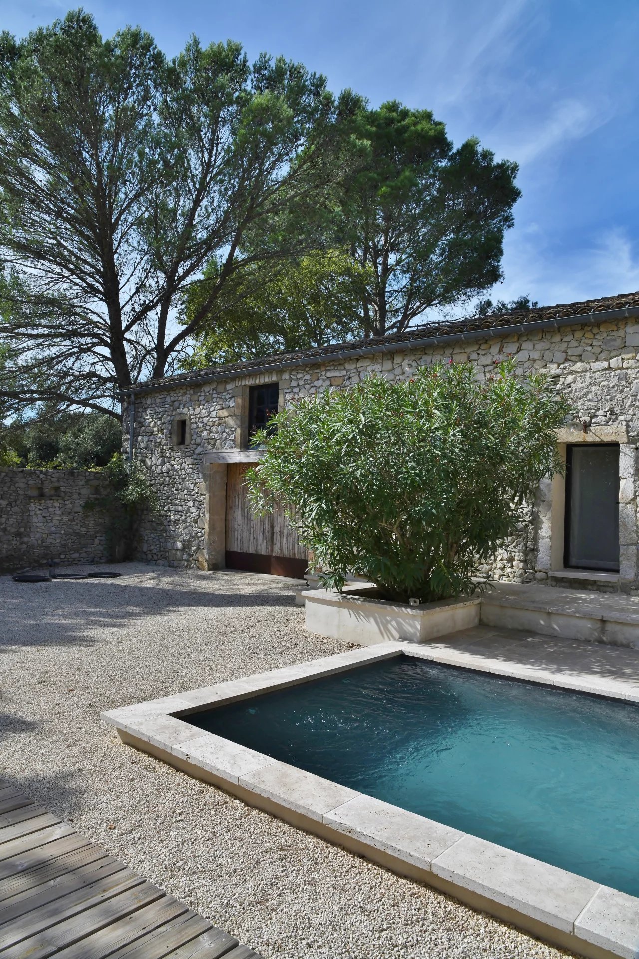 The enclosed garden with trees and a 6 x 3 metre swimming pool offers an intimate and pleasant outdoor space, ideal for relaxation.
