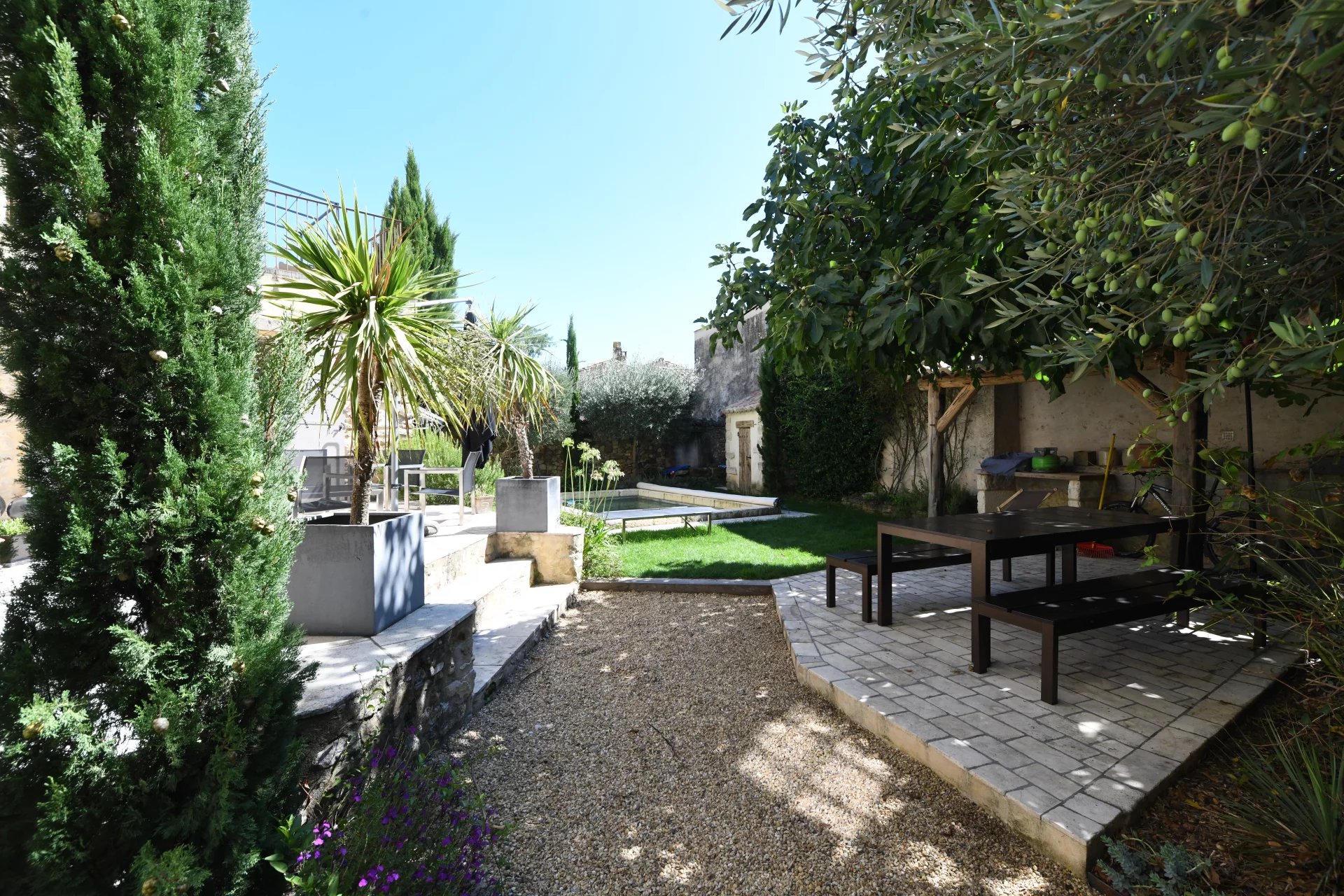 On the first floor, there is a 23 m² master bedroom with its own bathroom. A second staircase leads to two other spacious and bright suites. One opens onto a terrace offering a magnificent view of the old village and its bell tower. Outside, the wooded garden is a real asset, complete with a terrace and swimming pool.