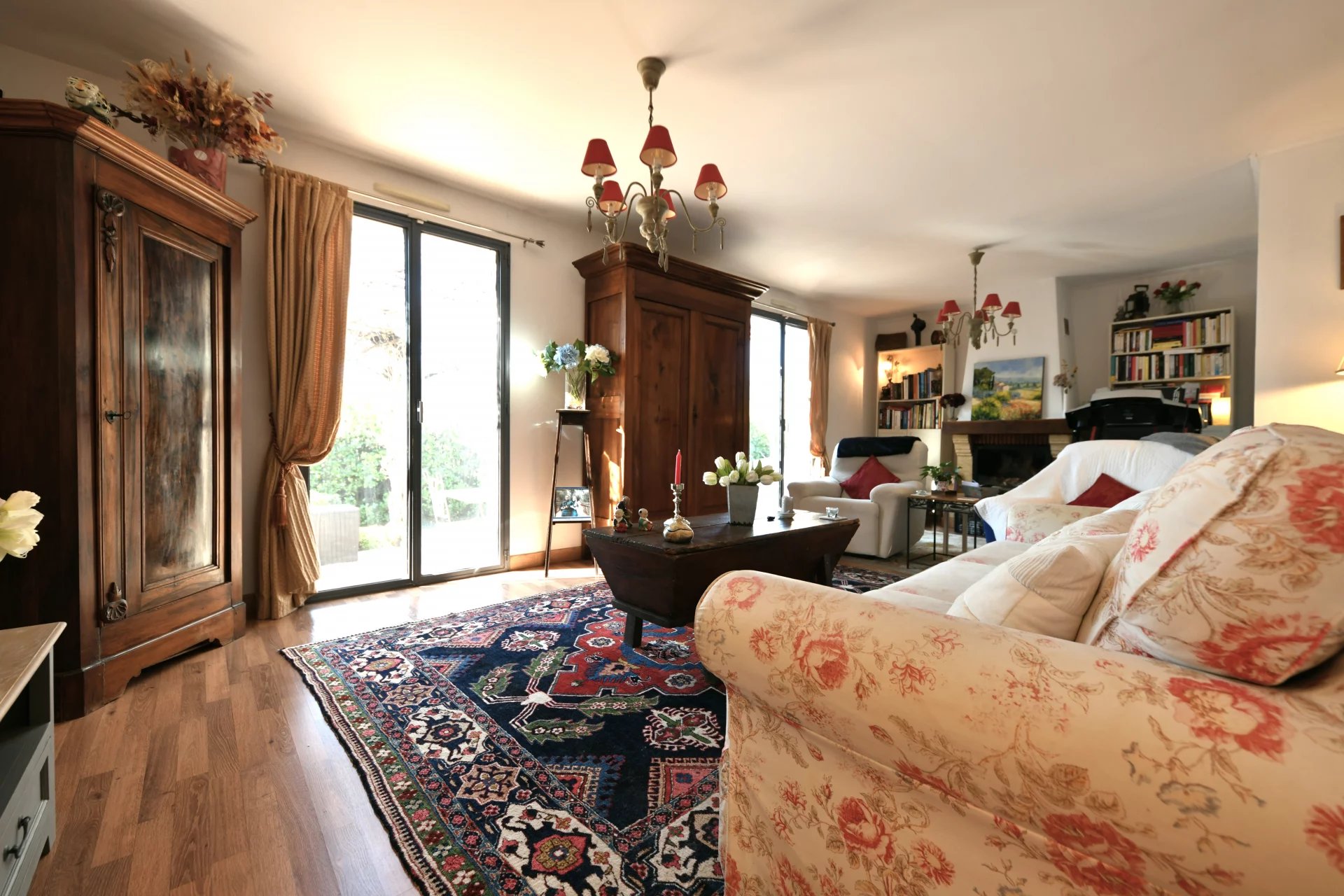 Upon entering the house, one is greeted by a luminous veranda thanks to its full southern exposition. A fully fitted kitchen with an exit onto the garden and pool area. In the living room, 2 sets of double doors allow easy access to the terrace situated on the south facing facade. A chimney insert completes this room.