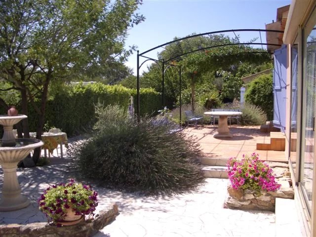 Upon entering the garden, on one side, hidden behind a large hedge, a court, perfect for playing the local sport; pétanque. A few steps above, a large secure pool area complete with a pool house (17m²) with a fully fitted kitchen and salon. A separate toilet and outdoor shower complete the area.