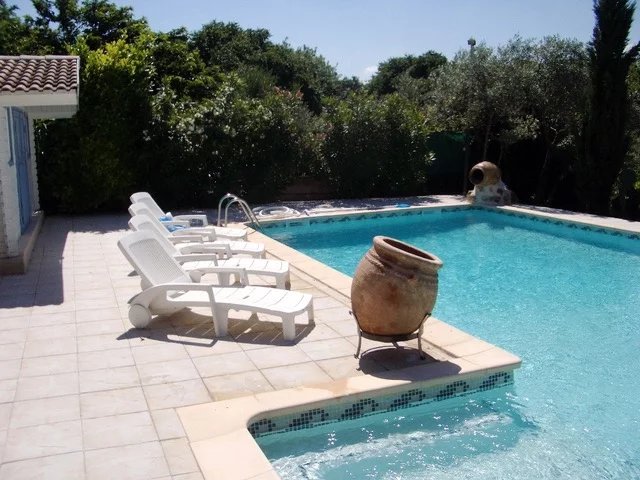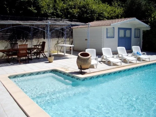 Upon entering the garden, on one side, hidden behind a large hedge, a court, perfect for playing the local sport; pétanque. A few steps above, a large secure pool area complete with a pool house (17m²) with a fully fitted kitchen and salon. A separate toilet and outdoor shower complete the area.