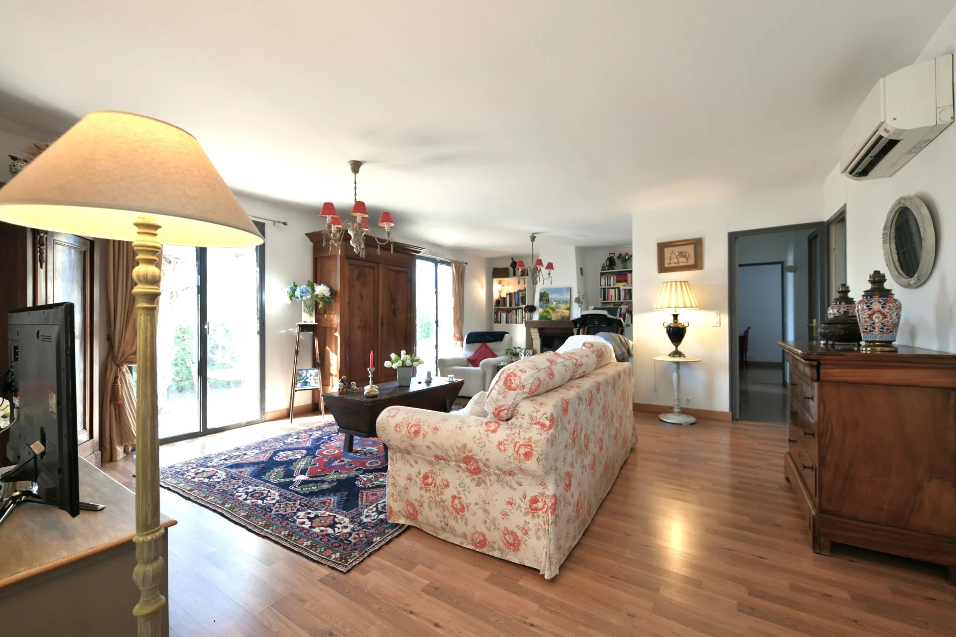 Upon entering the house, one is greeted by a luminous veranda thanks to its full southern exposition. A fully fitted kitchen with an exit onto the garden and pool area. In the living room, 2 sets of double doors allow easy access to the terrace situated on the south facing facade. A chimney insert completes this room.